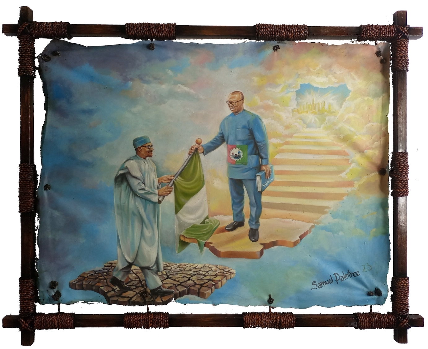 Enugu-based artist Otti Emmanuel Ifeanyi made a portrait using grains of table salt. Obi’s black suit and the work’s black surface provide a contrast for the sprinkled salt, giving the portrait the feel of a black-and-white picture. Speaking about his work, Otti said: “Obi represents the salt of the earth among the present crops of leaders.” Samuel Palmtree Ifeanyichukwu made a painting that shows Obi receiving the national flag from the incumbent president, Muhammadu Buhari, whose tenure will end in May 2023. Obi descends from a heaven-scape paved with gold. Wearing a blue suit emblazoned with his party’s logo and receiving the national flag, he holds a book in his left hand. The book symbolizes Obi’s awareness of the problems within the country and roadmaps toward solving them. A second painting, presented to him at a rally in North-Central Nigeria, shows Obi among the people. Another interesting portrait is a non-fungible token (NFT) listed on the Ethereum blockchain by artist Chuma Anagbado. One of the trending pictures of the presidential election, it shows Obi during one of his many speaking engagements. The work is a black-and-white line drawing framed by the green and red colors of Obi’s party. “It is my contribution to enthrone good governance to save Nigeria,” the artist said.