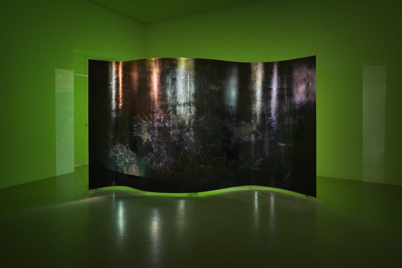 Sandra Mujinga, »Nocturnal Kinship«, 2018 und »Camouflage Waves 1-3«, 2018. Installation View at Kunstverein Hannover. Photo: Raimund Zakowski