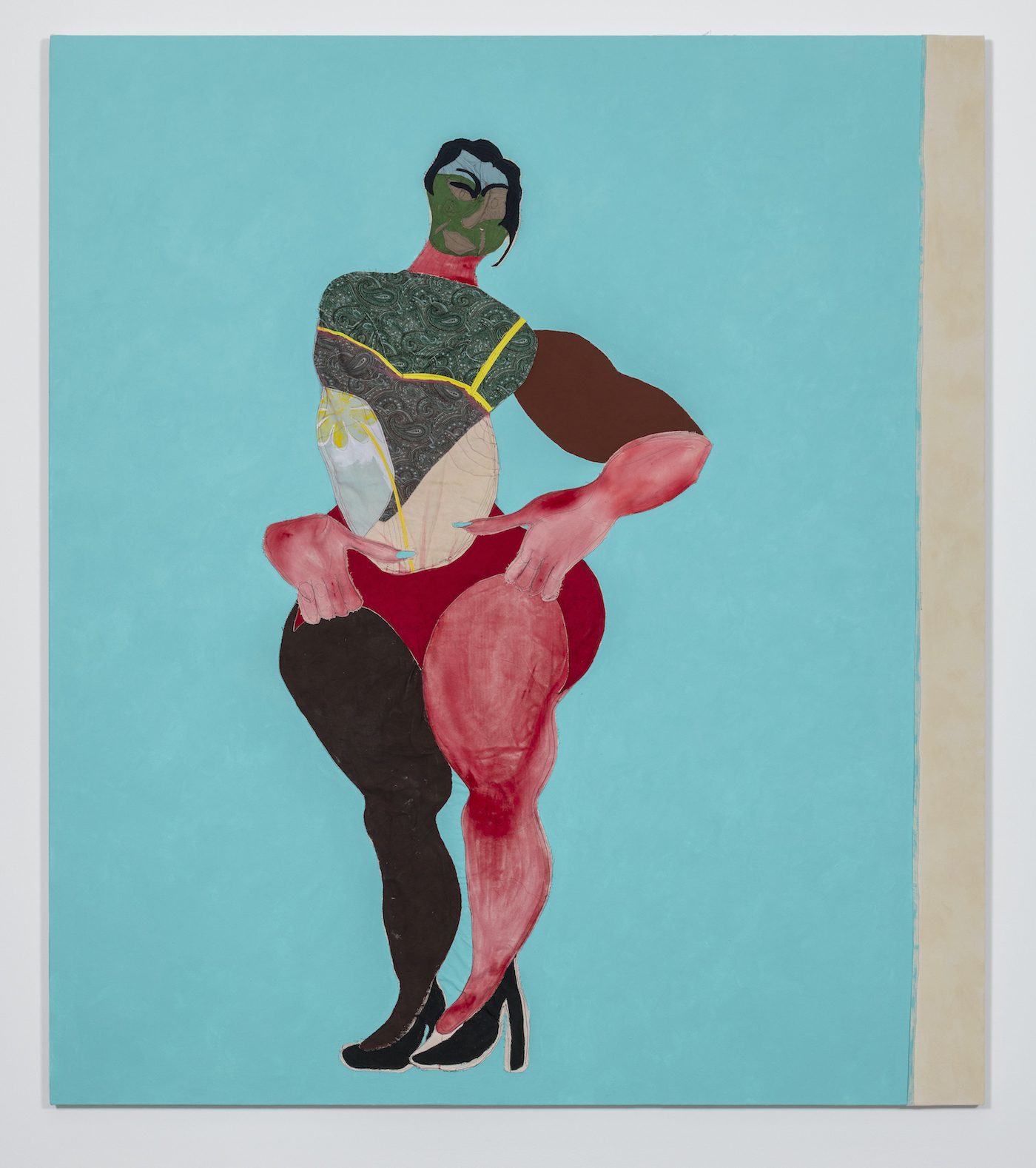 Tschabalala Self, »Leotard«, 2019. Fabric, painted paper and acrylic on canvas, 243.8 x 213.4 cm. Courtesy of the artist and Pilar Corrias, London.