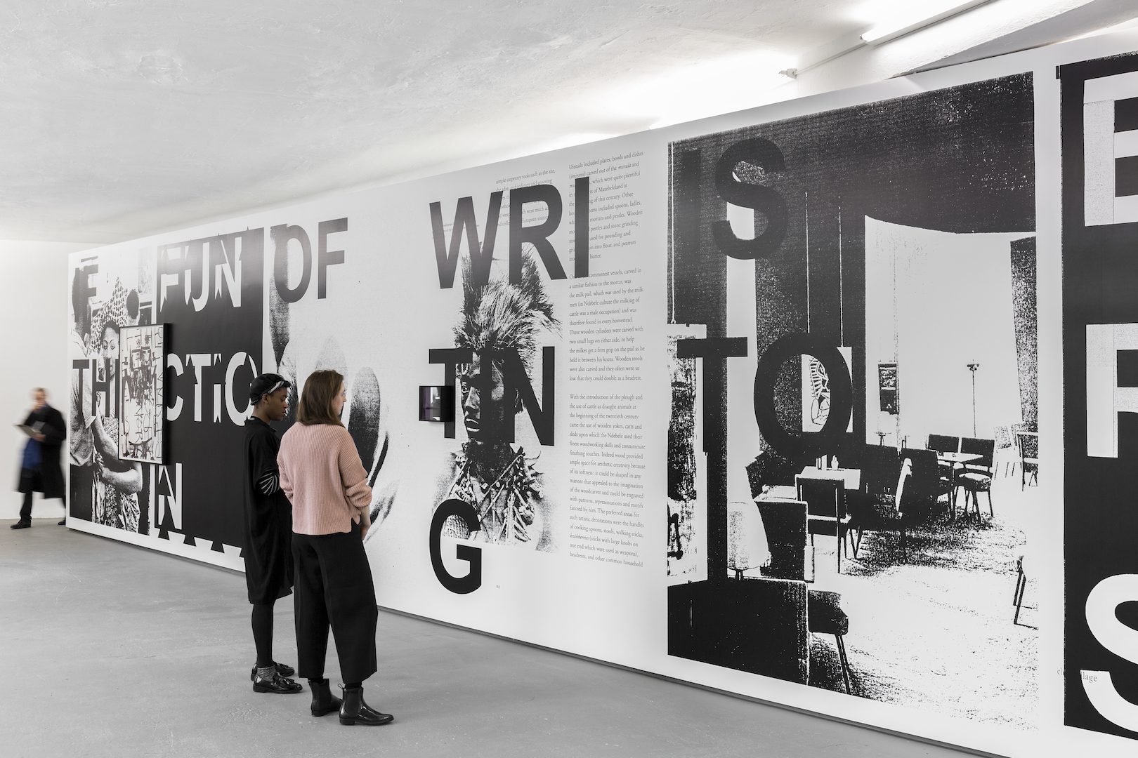 AP: From a practical standpoint, the wall represents a spatial solution, which then ended up influencing the display and the function of the work within the space. It literally bisects the entire gallery space and became a kind of a continuous surface. The wall works with those different images and references: from the couple dancing during the Congo Independence Day in 1960 to a photograph of a flower by a Bauhaus student to a documentation of the first Documenta to fabric samples. All of these works are using language in variant degrees of abstraction. I think the architectural disruption becomes a question of legibility in terms of space, how we perceive and move through space, so there’s a kind of confluence of gesture, both in a grave and playful way.