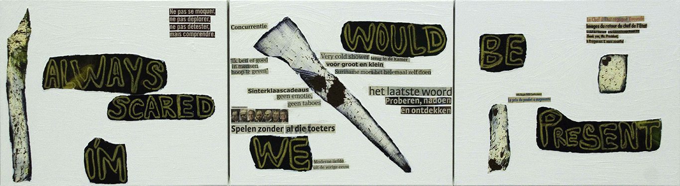 Guy Woueté, Today or tomorrow I, II, 2013. Triptych, mixed media on canvas; 180 cm x 50 cm. © Guy Woueté