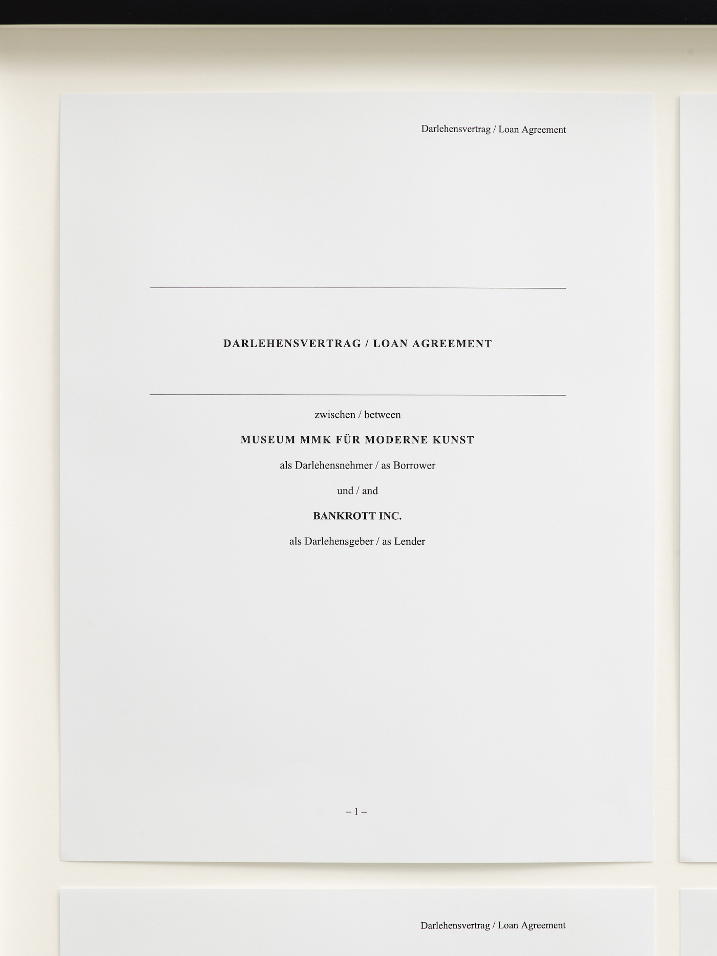 In twenty-five years, the Museum für Moderne Kunst (MMK) in Frankfurt will owe Cameron Rowland 1,256,518.73 Euros. This is the amount that the sum of €20,000, which Rowland lent to the museum as part of his exhibition Amt 45 i, on view at TowerMMK , will generate at an annual interest rate of 18 percent. More specifically, the museum will owe this money to the corporation Bankrott Inc., which Rowland founded and also directs. The legally binding loan agreement, which is an element in the artwork Bankrott (Bankruptcy, 2023), and can be viewed, page by page, in the exhibition. Although the life of the loan is indefinite, the table included as an annex to the contract gives an overview of how the debt will develop up to the year 2122.  By that year the MMK will owe the corporation €311,591,692,053.27 – an astronomical sum that would currently exceed the economic output of the entire metropolitan region of FrankfurtRhineMain.