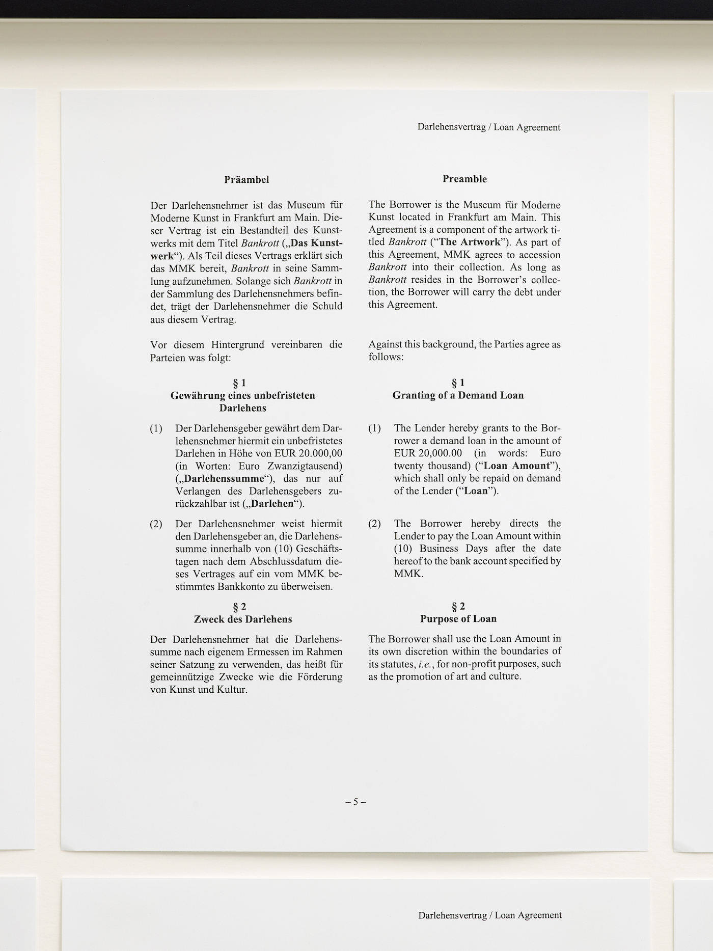 A loan of 20,000 euros was issued to the Museum MMK für Moderne Kunst from Bankrott Inc., a company created for the purpose of holding an indefinite debt. Because it is a demand loan, no payments can be made until the lender demands repayment. Bankrott Inc. will never demand repayment. The debt will accrue interest indefinitely. It will increase at a rate of 18 percent each year, the highest rate legally allowable. The Museum MMK für Moderne Kunst is a city government department, Amt 45 i. For this reason this debt is owed by the city of Frankfurt am Main.