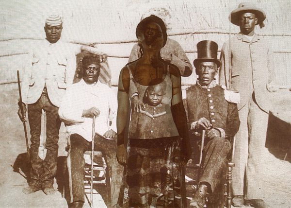 Iduma: As writers, thinkers, and image makers, we have to be willing to confront the ambiguity of our relationship with the archive, to realize that, more often than not, our bodies were pictured in denigrating ways. And how we were seen has shaped our perception of who we are. I hope for my work to begin by engaging with this complicity, but then surpassing and counteracting it. I think now of a certain photograph by the South African artist Nomusa Makhubu, Imfundo Impahla neBhayibheli (Education Apparel and the Bible) from The Self Portraiture Project (2007/2013). In the image, she projects her silhouetted body on a colonial photograph of five men and a boy, taken by A. James Gribble in South Africa. It’s a metaphorical lodestar for me. At once repudiation as reclamation, the outline of her body is imposed on the archive; but equally, she can no longer be seen apart from it.