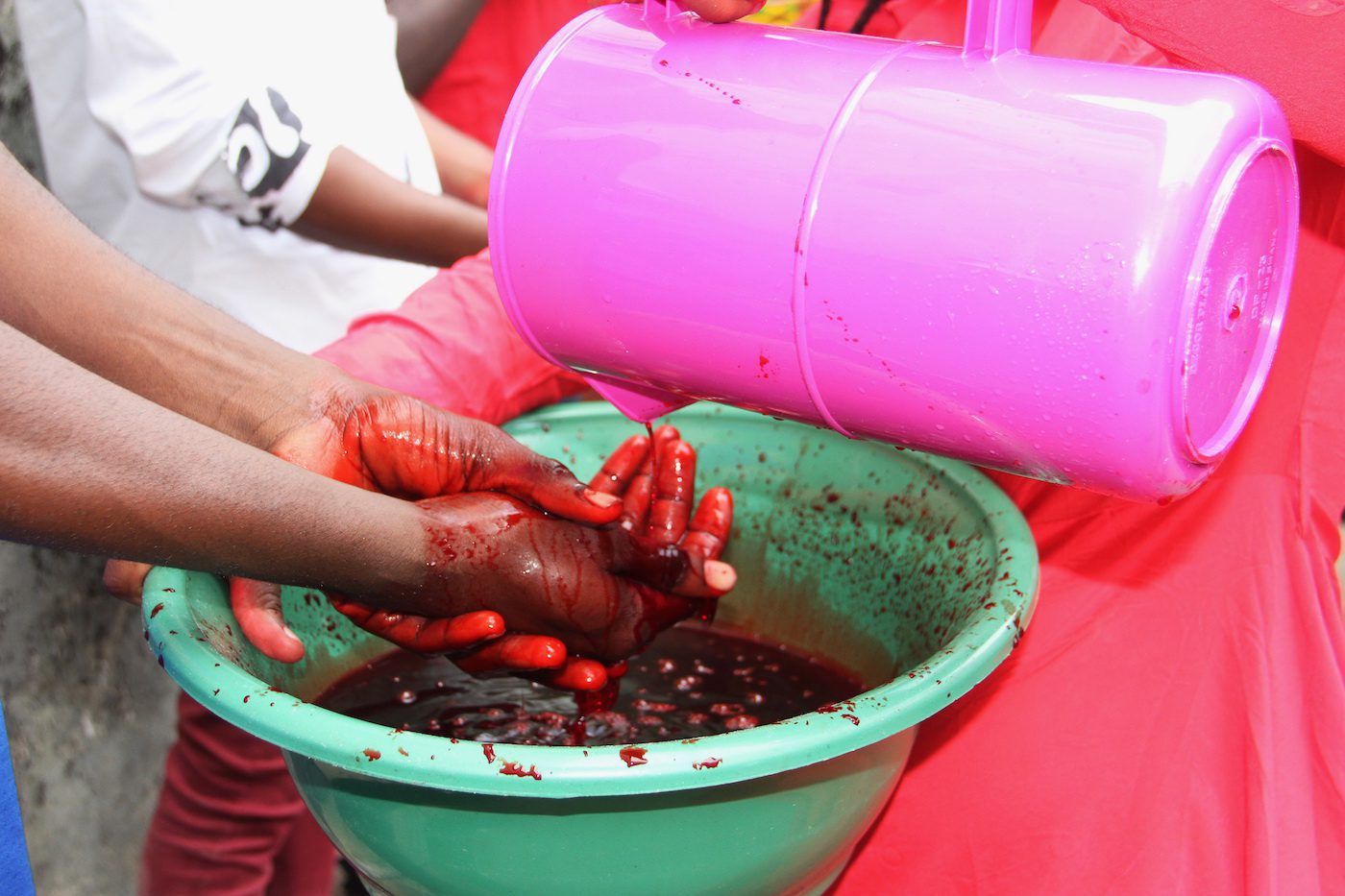 Exploring the notion of having blood on her hands for not voting in the recent Zimbabwe elections, Mukwazhi draws viewers into her performance as participants. Photo: Ruth Simbao