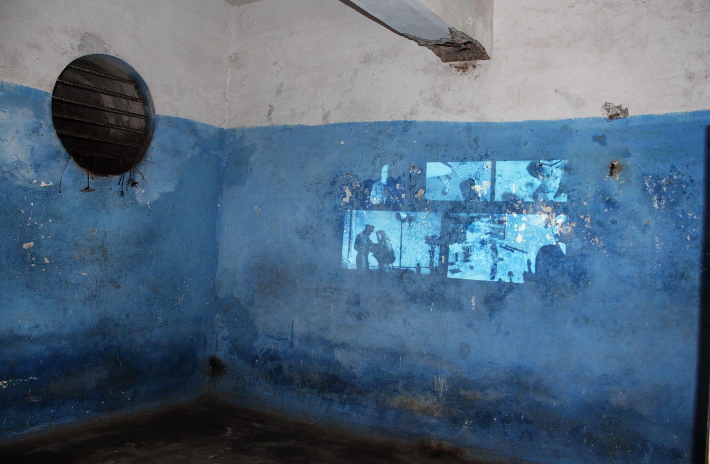 A video and photography installation in a prison cell at James Fort by the collective Ubulungiswa/Justice. Photo: Ruth Simbao