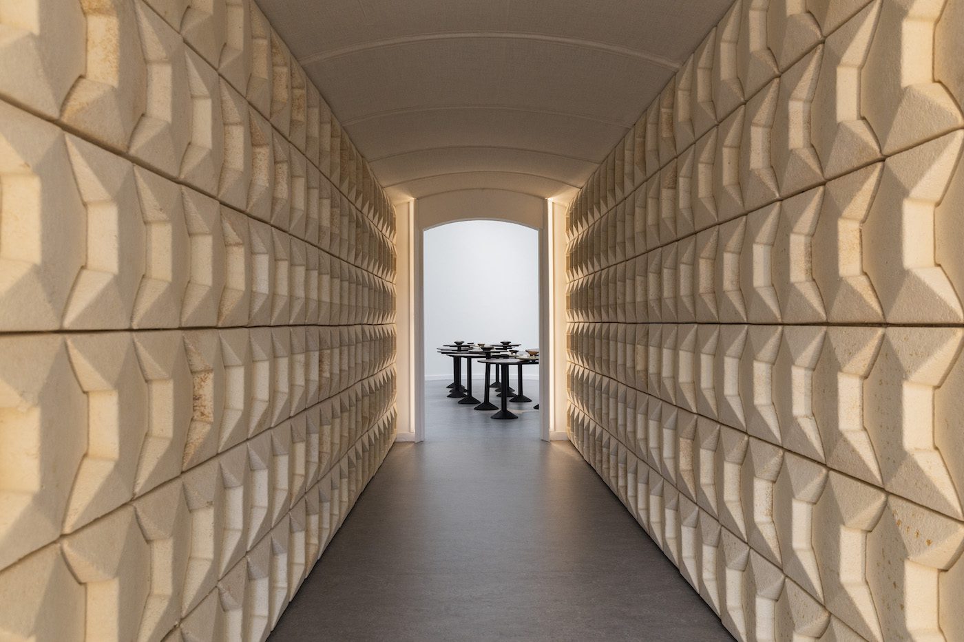 EB: Your work Myco Tunnel (2021) was a bio- architectural pathway. The wall was neutral in color, interspersed with serial textured ridges. What was the logic behind these choices?