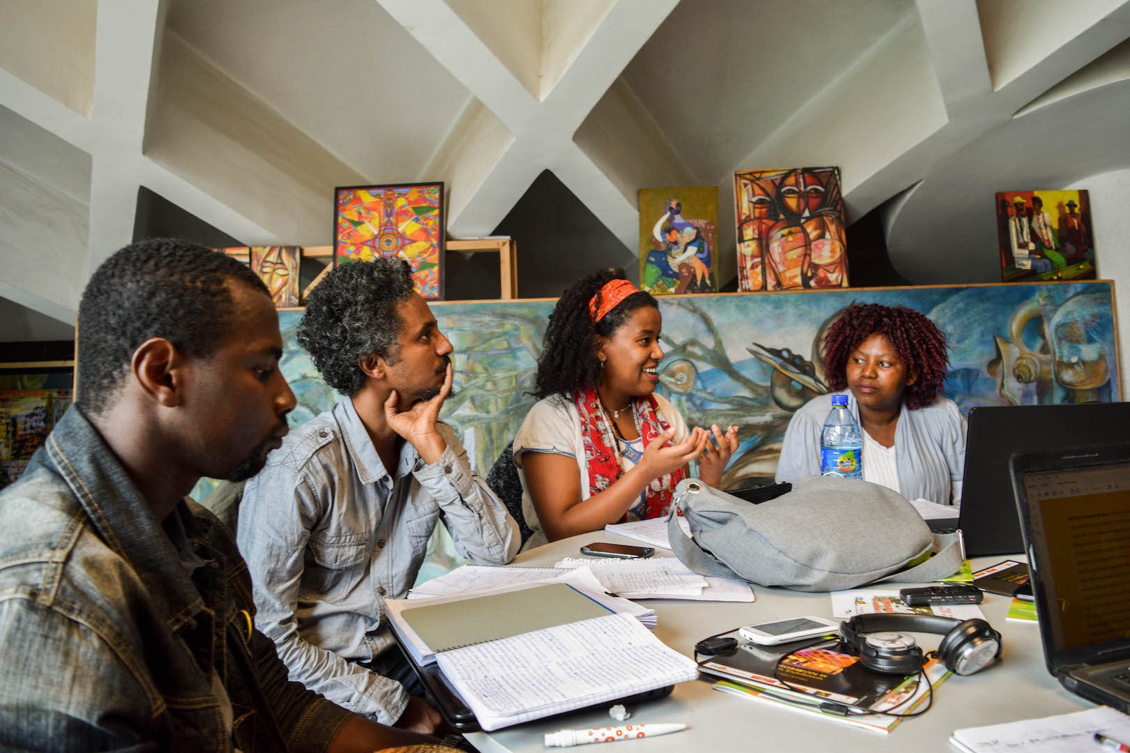 Yves Makongo, Eyob Kitaba, Ruth Ademasu, Mercy Moyo during a class session at Laphto Art Gallery in Addis Ababa. Photo: Ayo Akinwande