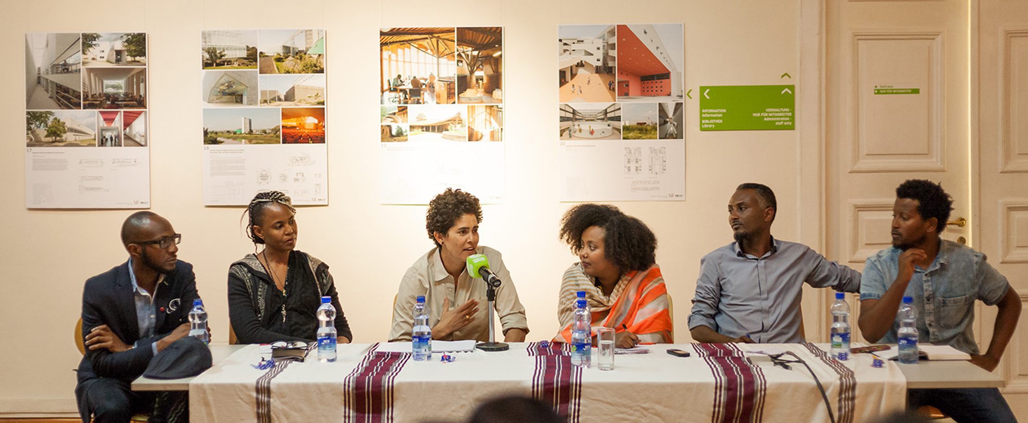 Teju Cole, Wangechi Mutu, Tibebeselassie Tigabu, Berhamu Ashagrie Deribew, Robel Temesgen at the Addis Show Symposium held at Goethe Institut in Addis Ababa. Photo: Papa Shabani