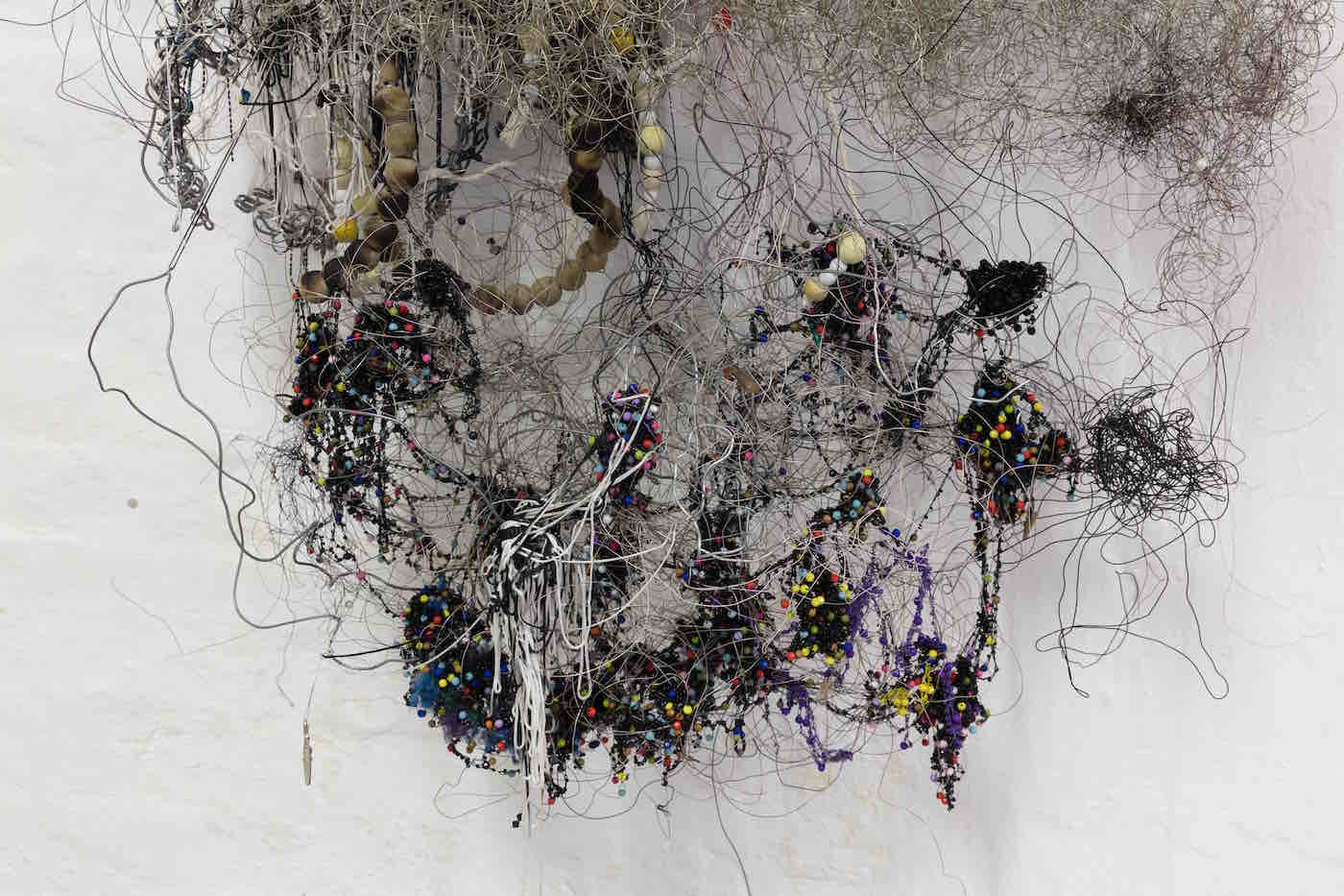 Igshaan Adams, Search, 2018. Wire, beads, bead necklaces fringe, cotton thread, rope, memory springs; approx 110 x 55 x 122 cm (detail). Courtesy of Standard Bank Gallery.