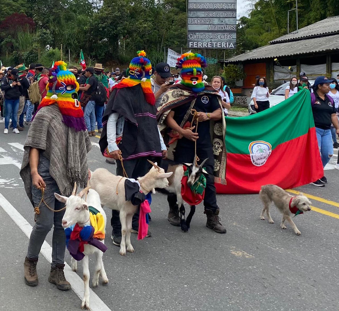 CMPD : La grève a commencé le 28 avril 2021 et le même jour, nous avons manifesté en tant que collectif à Popayán. Eyder Calambás a revêtu la ruana misak [type de poncho traditionnel colombien], Edison Quiñones celle du peuple nasa et Jennifer Ávila celle des Yanakuna. Nous avons porté le masque « Aya-Huma », l’esprit qui enseigne la danse de l’Inti Raymi au peuple andin. Avec nous, nous avons amené trois chèvres : Fuerza (Force), Guardia (Vigilance) et Tierra (Terre). Elles étaient drapées dans les drapeaux des peuples autochtones et du CRIC. C’était une manière différente de protester, un acte performatif, une action qui consistait à marcher à côté des chèvres tout au long du parcours et à rendre la protestation visible par l’art. En un sens, cet exercice était un acte pédagogique.
