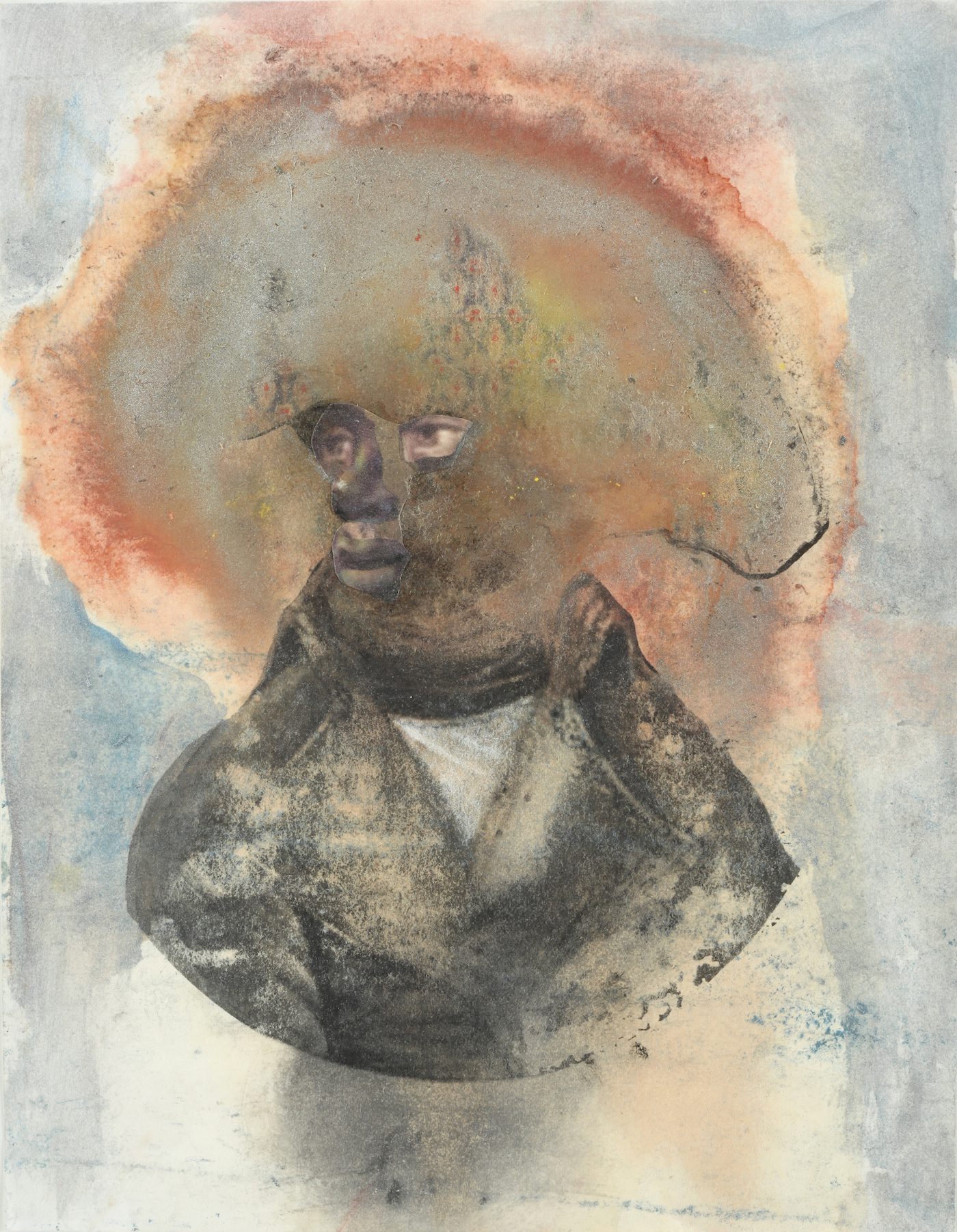 David Shrobe’s interest in everyday objects that he encounters in his New York neighborhood is a way of initiating a discourse on re-assembling and decoding Black materiality. The portraits he builds are a nod to the work of Betye Saar and Noah Purifoy, both artists who grew out of the 1960’s/70’s LA art movement. His work, however, brings his East Coast perspective to the wall. In New York he is in a constant dance with his own practice as a painter, sculptor and mixed-media artist, using charcoal, oil, flocking and metallic paint as ways to reinterpret found materials from the city. In a brief conversation I had with Shrobe, he spoke about his process: “Even when I’m painting, I am working in a collage logic (…) A lot of my images become hybridized, drawing from Black Diaspora and African cultures—I am considering potential futures”. His background in fashion and his knowledge of textiles has helped him move his practice towards a more playful approach to materiality.