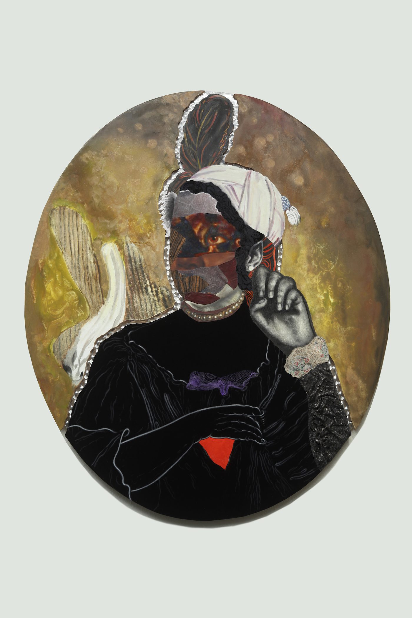 David Shrobe’s interest in everyday objects that he encounters in his New York neighborhood is a way of initiating a discourse on re-assembling and decoding Black materiality. The portraits he builds are a nod to the work of Betye Saar and Noah Purifoy, both artists who grew out of the 1960’s/70’s LA art movement. His work, however, brings his East Coast perspective to the wall. In New York he is in a constant dance with his own practice as a painter, sculptor and mixed-media artist, using charcoal, oil, flocking and metallic paint as ways to reinterpret found materials from the city. In a brief conversation I had with Shrobe, he spoke about his process: “Even when I’m painting, I am working in a collage logic (…) A lot of my images become hybridized, drawing from Black Diaspora and African cultures—I am considering potential futures”. His background in fashion and his knowledge of textiles has helped him move his practice towards a more playful approach to materiality.