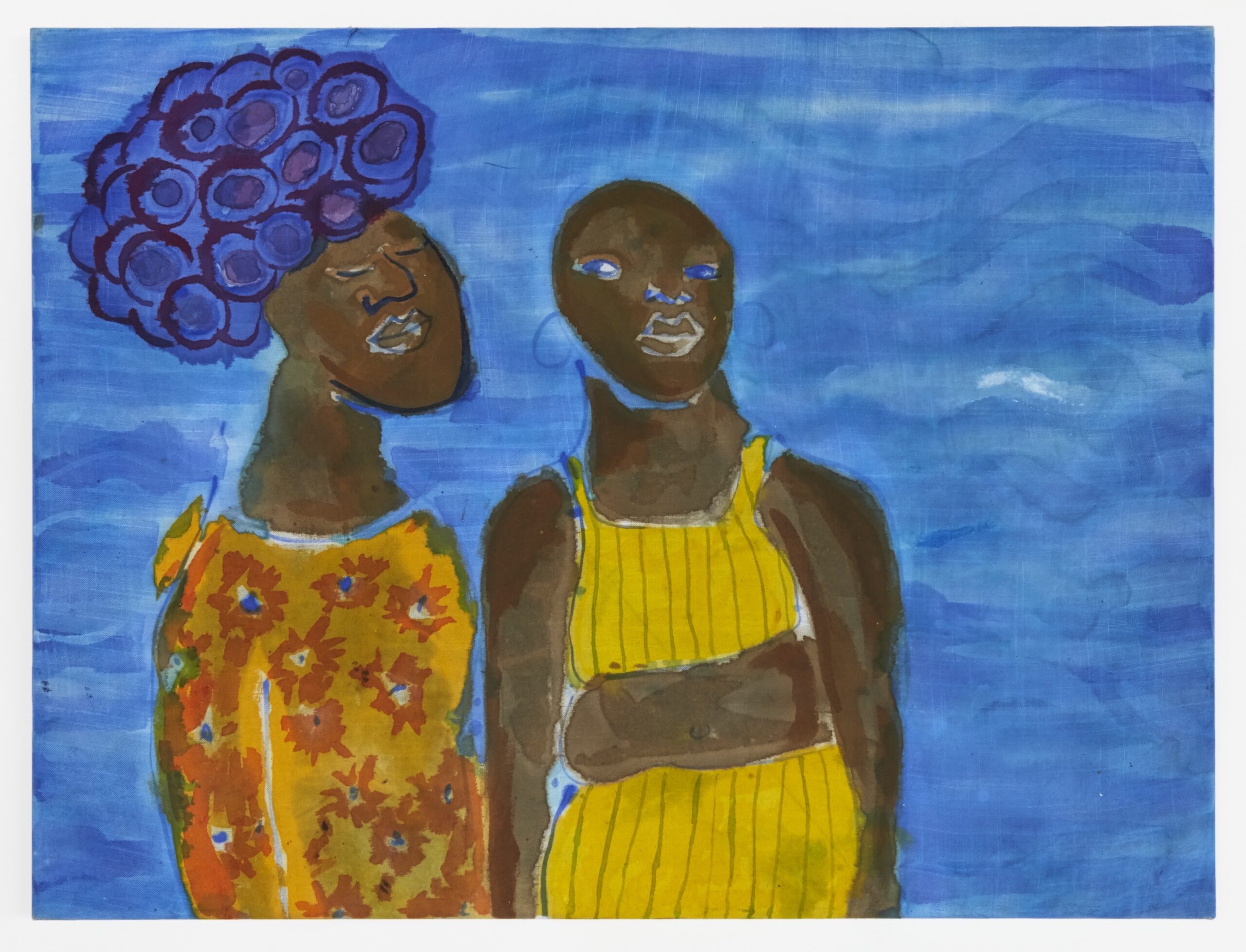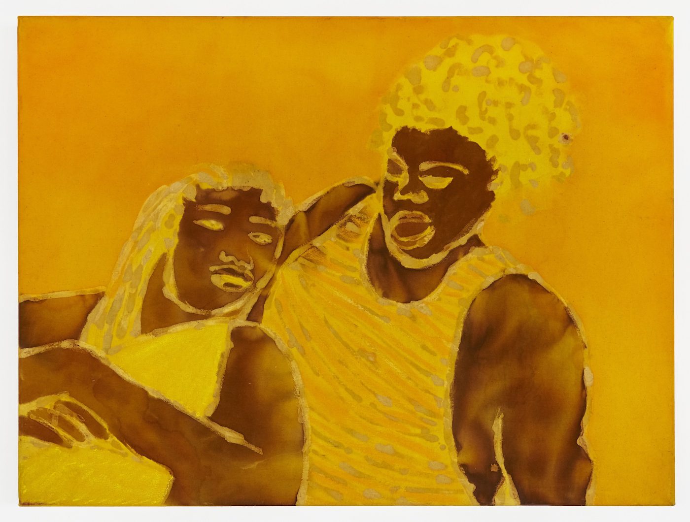 “When titling my paintings, as I’m not great with words, I turn to other people’s. To their lyrics and poetry. I’m interested in the ocean and the way it moves,” Olulode says, “how expansive it is. There are ups and downs. It’s incomprehensible and deeply mysterious.” Taken from Travis Alabanza’s poem “The Sea,” the exhibition’s title refers to a futile attempt to describe the indescribable. Alabanza begins: “Sometimes I stand by the edge of where the ocean meets the beach, and look out into the sea, so I can see something that does not have an end.” Alabanza writes on the genderfluid experience as a “boundless place,” on its nuances and malleability. Olulode appropriates this sentiment, suspending her figures in a place unknown to us. They are neither indoors or outdoors; it would be a struggle to date them by their clothing. At times, the lines demarcating limbs from body from hair from backgrounds vanish entirely. Some of the Black bodies aren’t Black at all, but indigo or turmeric-yellow, their features etched in bleach or emphasised with wax. Suddenly the familiar painted format seems unfamiliar. Who are they? Where are they? “They exist in a space that is purely emotion,” I’m told. “These people are in love, with each other. It’s not friendship, though some people assume that.”