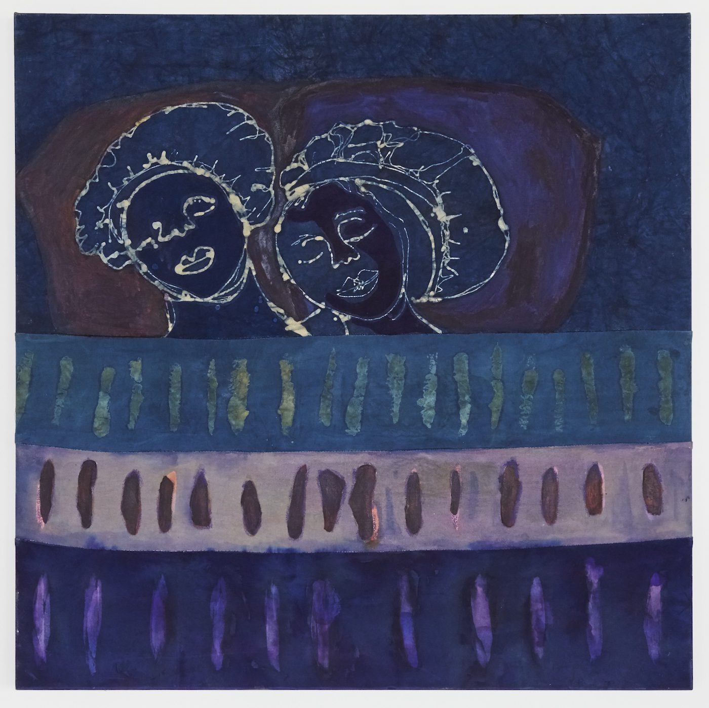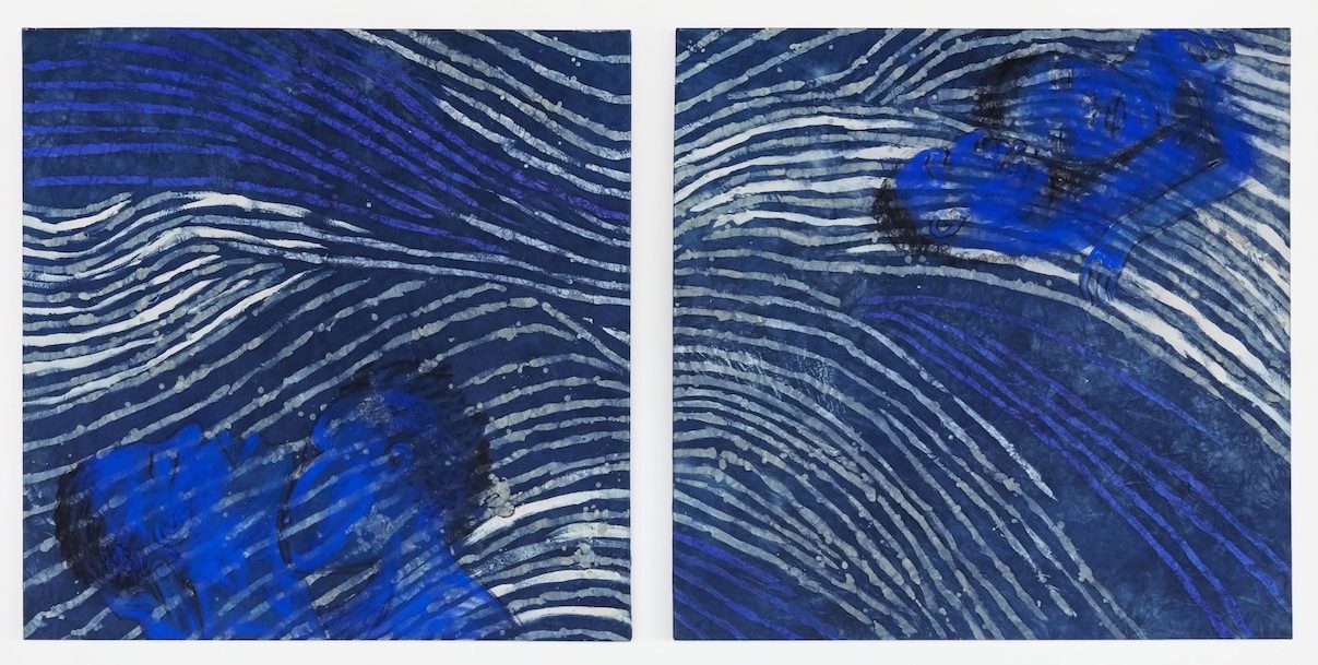 In Safety (2019), two women lie in a wistful slumber under a wash of rich blue, a result of Olulode’s experiments with adire cloth, an indigo-dyed textile typically produced by Yoruba women in southwestern Nigeria. The inky, rich palette flattens the image. The bleached outlines of the figures and their features leap forward. Three horizontal strips of canvas – plum, lilac, and cerulean – form the bottom half of the work. Sewn together, the lateral strips of fabric form a quilt, covering the sleeping couple. The visible stitches prompt memories of sewing as a maternal act – so intimate and repetitive, homely and safe. “Would you say your practice functions as a consolidation of Yoruba textile traditions and the Western painting canon?” I ask. “Yes,” she replies. “I do want to represent that part of my … I don’t want to say ‘ancestry’ … it’s a part of myself.”