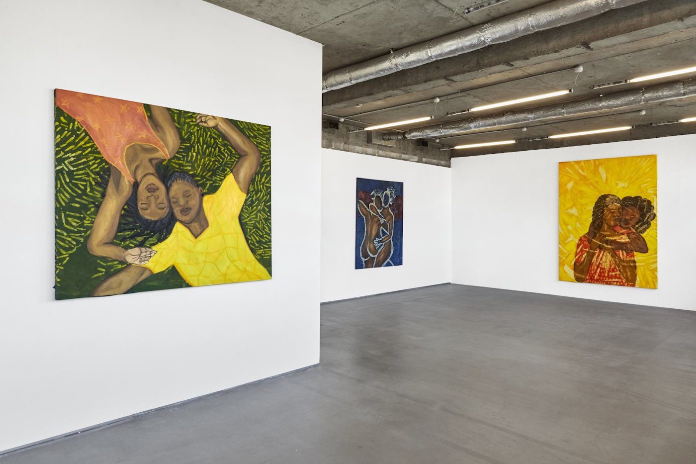 Working from screenshots of viral videos, images of doting queer couples, and other resources found on the internet, Olulode paints Black queer romance in a world beyond reality, a place it can thrive unquestioned. She says: “When painting dancers I look for specific energetic moments to capture. I guess it’s quite intuitive for me.” Unlike Lubaina Himid’s life-sized and almost interactive cutouts, Olulode’s figures, unheeding because of the attention they give to one another, appear impervious to our gaze. If they look forward, they look past us. Or, as in Entwined (2019), only at one another. “I’m always looking at relationships. Relationships between women and non-binary people,” Olulode tells me. It’s all we’re supposed to look at too.