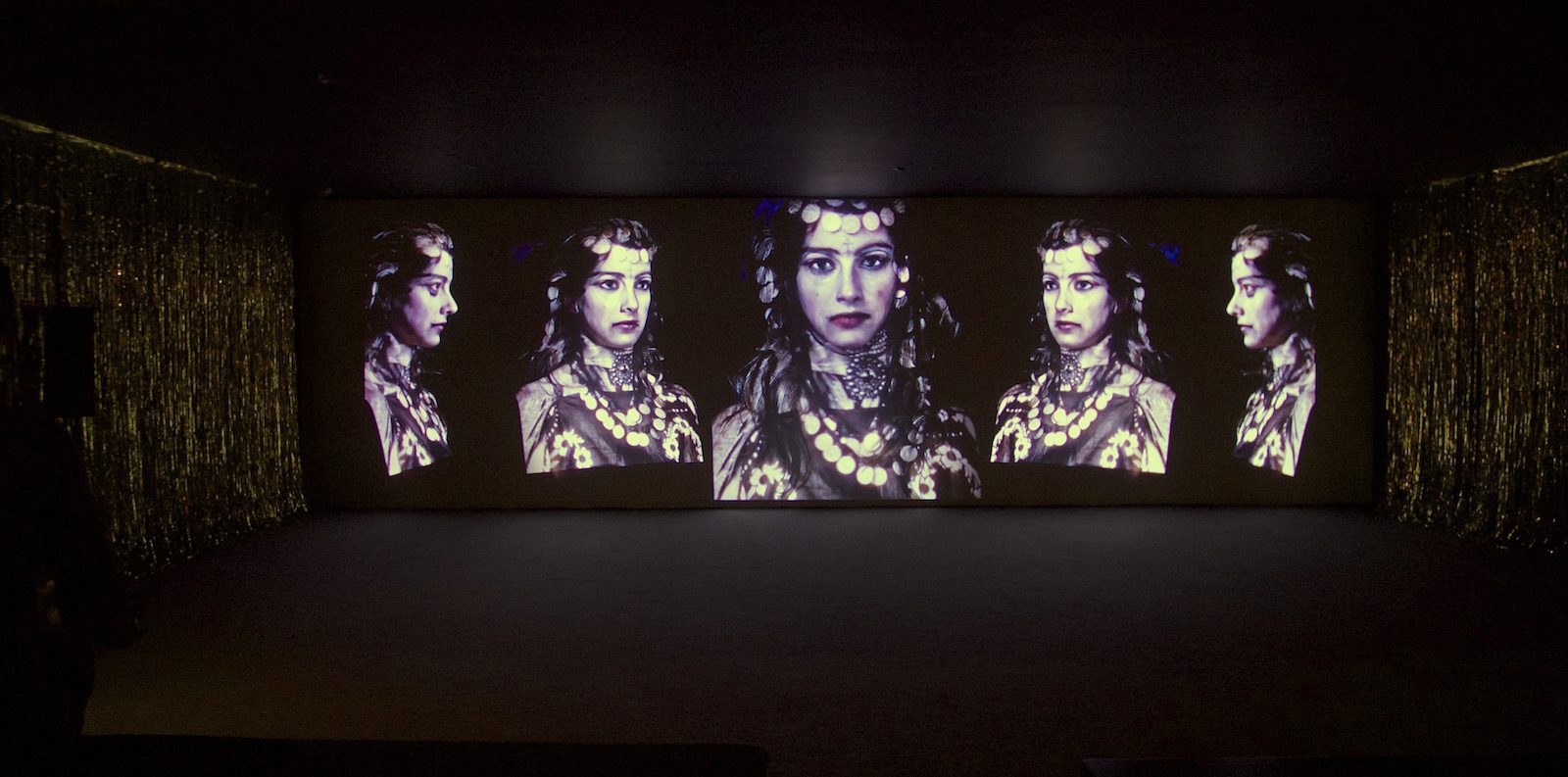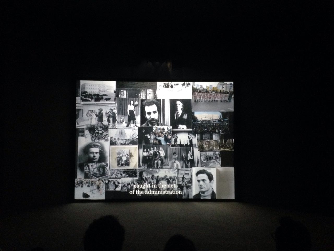 Bouchra Khalili, installation view The Tempest Society (2017). Digital film, color, sound 60 min. Produced by Bouchra Khalili and Alexandre Kauffmann. Coproduced with Ibsen Awars´ds, Ibsen Theater, Skien, Norway. With the support of Foundation National des Arts Graphiques et Plastiques, Paris, and the Holland Festival, Amsterdam. documenta 14 in Athens, 2017. Photo by C&