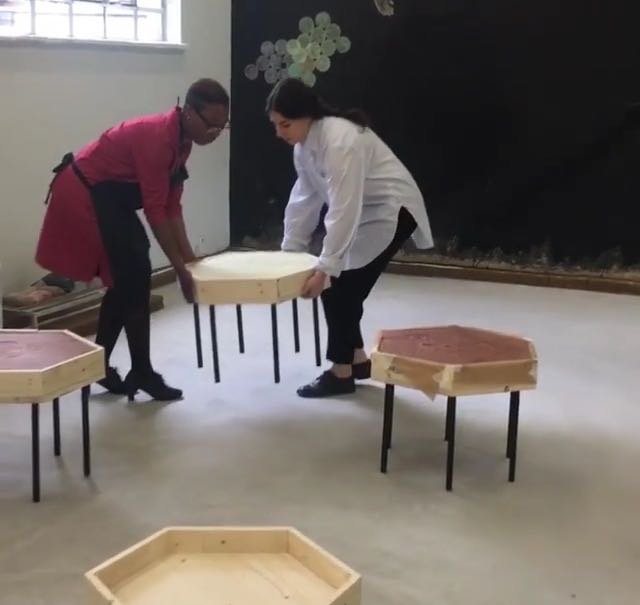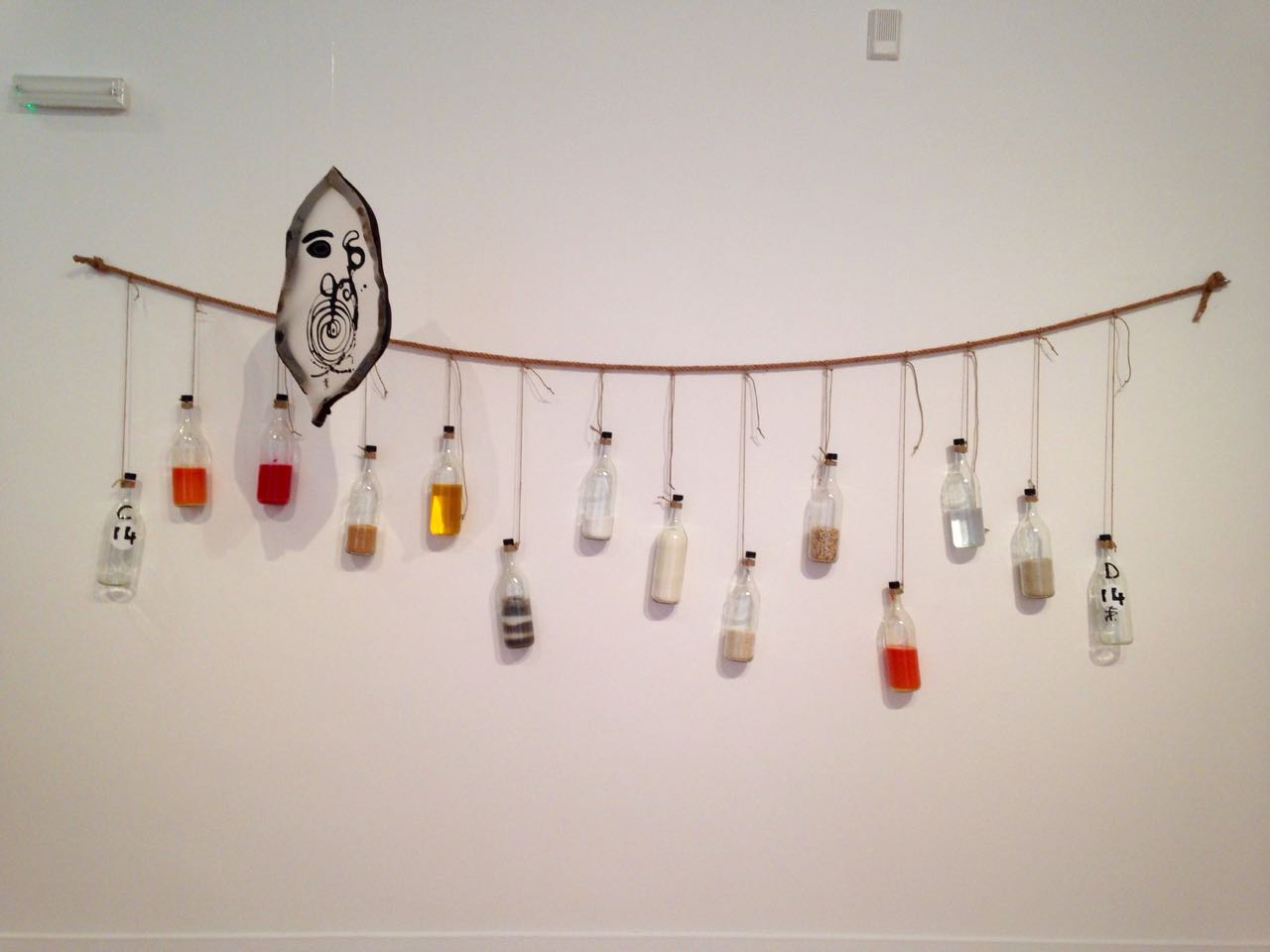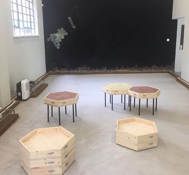 Otobong Nkanga, installation view Carved to Flow (2017). Laboratory installation and natural sop 08. Co-produces by Yanghyun Foundation, Seoul, and Ministerie van de Vlaamse Germeenschap, Departement Cultuur, Jeugd en Media, Brussels, Archimidous 15, Athens. documenta 14 in Athens, 2017