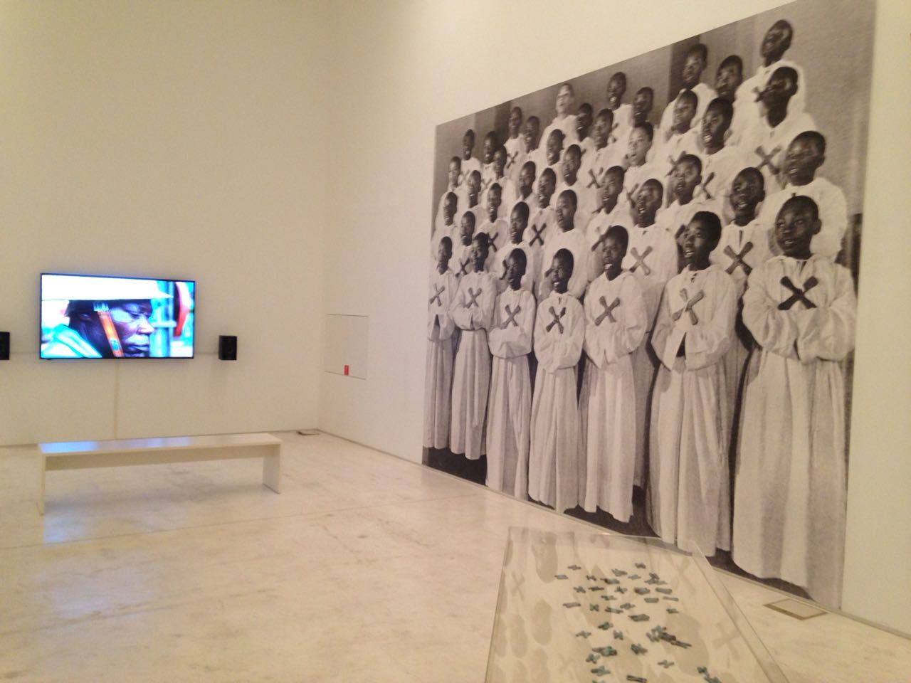 Sammy Baloji, installation view Tales of the Copper Cross Garden: Episode I (2917). Video, photographs, copper plate, upper crosses, coins. documenta 14 in Athens, 2017. Photo by C&