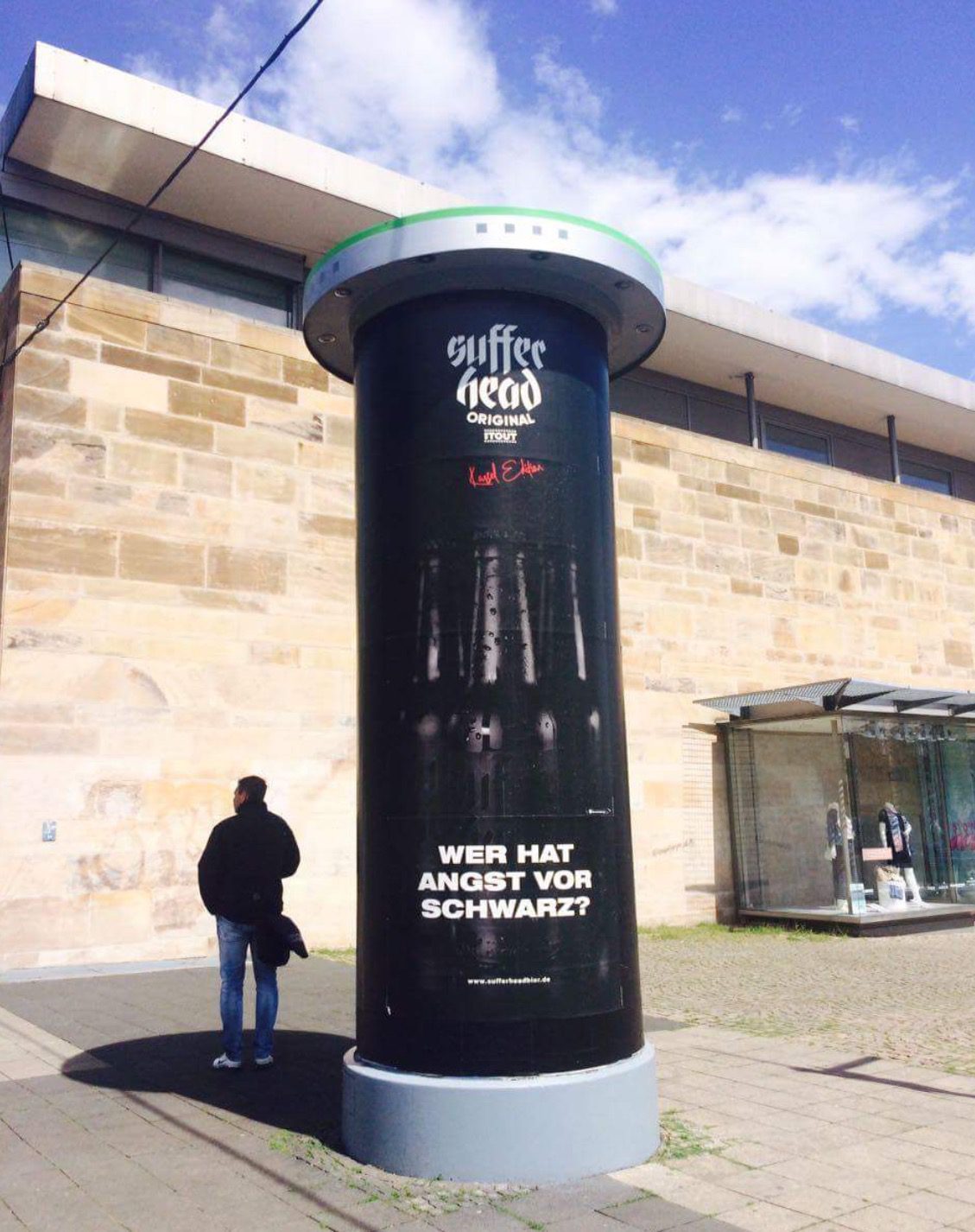 Emeka Ogboh, Sufferhead Original (Kassel Edition), 2017. 50.000 Flaschen Craft Beer, Werbetafeln, Werbespot, Radio-Jingle Verschiedene Orte in Kassel. Installation view at Friedrichsplatz. Photo: C&