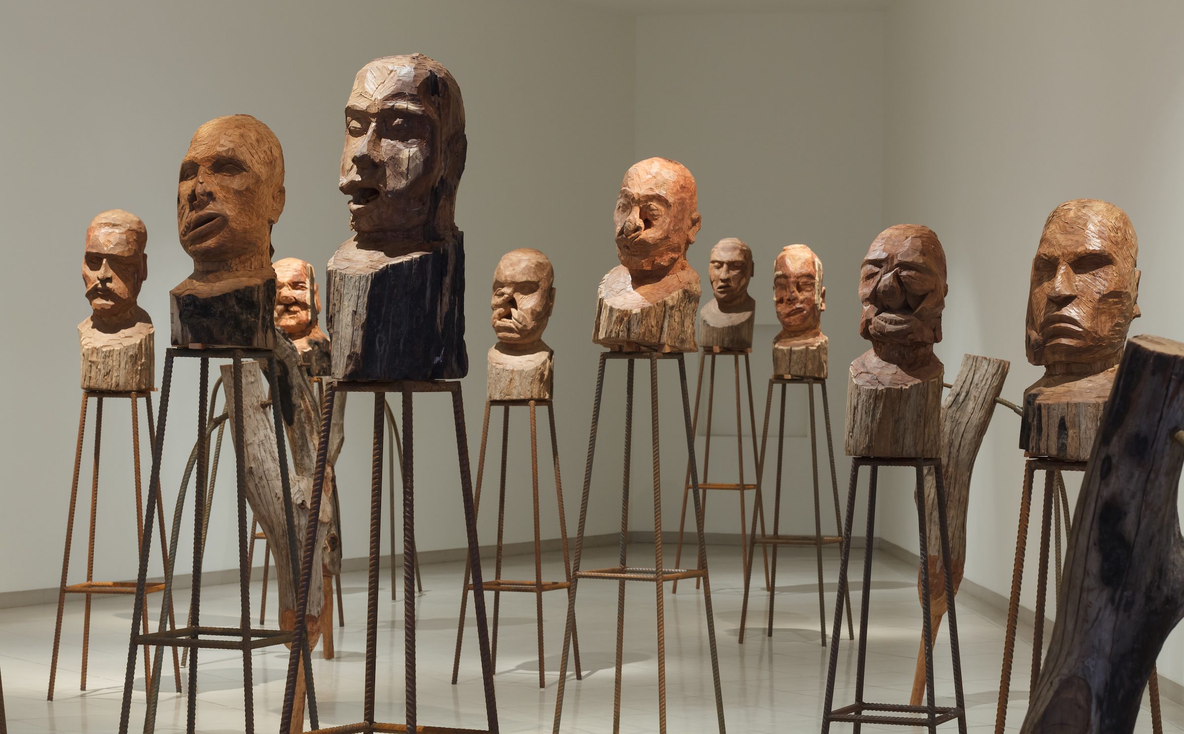 Wounds that have not healed are also the theme of Kader Attia’s monumental wooden busts, which he already presented in the installation The Repair from Occident to Extra-Occidental Cultures at the documenta in 2012 in Kassel. Senegalese whittlers carved the disfigured faces after First World War photographs depicting soldiers with severe facial injuries after having undergone plastic surgery. One of them is missing his cheek and part of his nose, others have deep scars. Attia calls this disturbing installation J’Accuse, and the 18 sculptures are facing the other side of the room, where a sequence of the silent film with the same name is being screened. With his 1938 work, the French filmmaker Abel Gance raised the soldiers maimed by the war from the dead – as a warning reminder. As we know from history, the horrific images were not deterring enough.