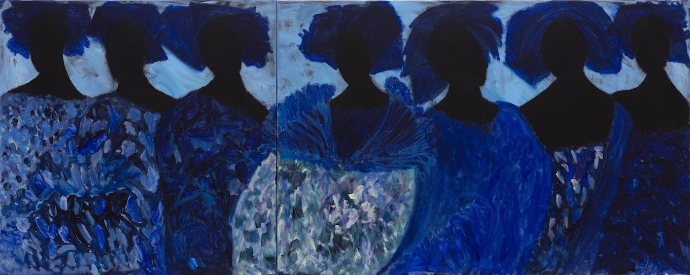 Ruth Ige, Seven Yoruba women with the gifts of healing, foresight and teleportation, 2024. Acrylic, oil stick and charcoal on canvas