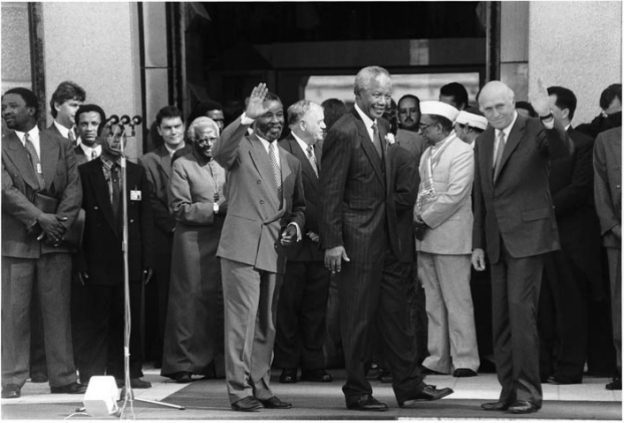 Outside Parliament on the 9th of May 1994. The official opening of the first Democratic Parliament with three Nobel Peace Prize Laureates: Desmond Tutu, Nelson Mandela and FW de Klerk. Vice President Thabo Mbeki left of Mandela. Photo © George Hallett