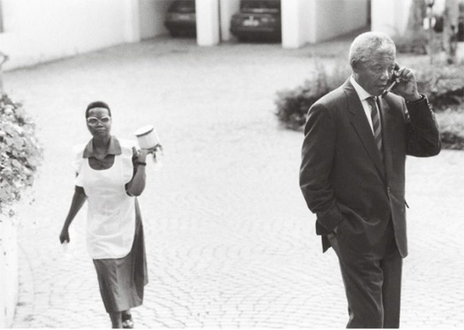 The photograph is clearly not posed: although the woman faces the camera, her gaze is not directed for the shot; she is simply walking by, on her way to her duties. And although she is as present in the frame as Mandela, it is he to whom we direct our attention: his face is partially in profile and bent into the phone and his eyes are cast downward, but his tall, slim figure, impeccably attired in a dark suit, striped tie, and white shirt commands our eye.