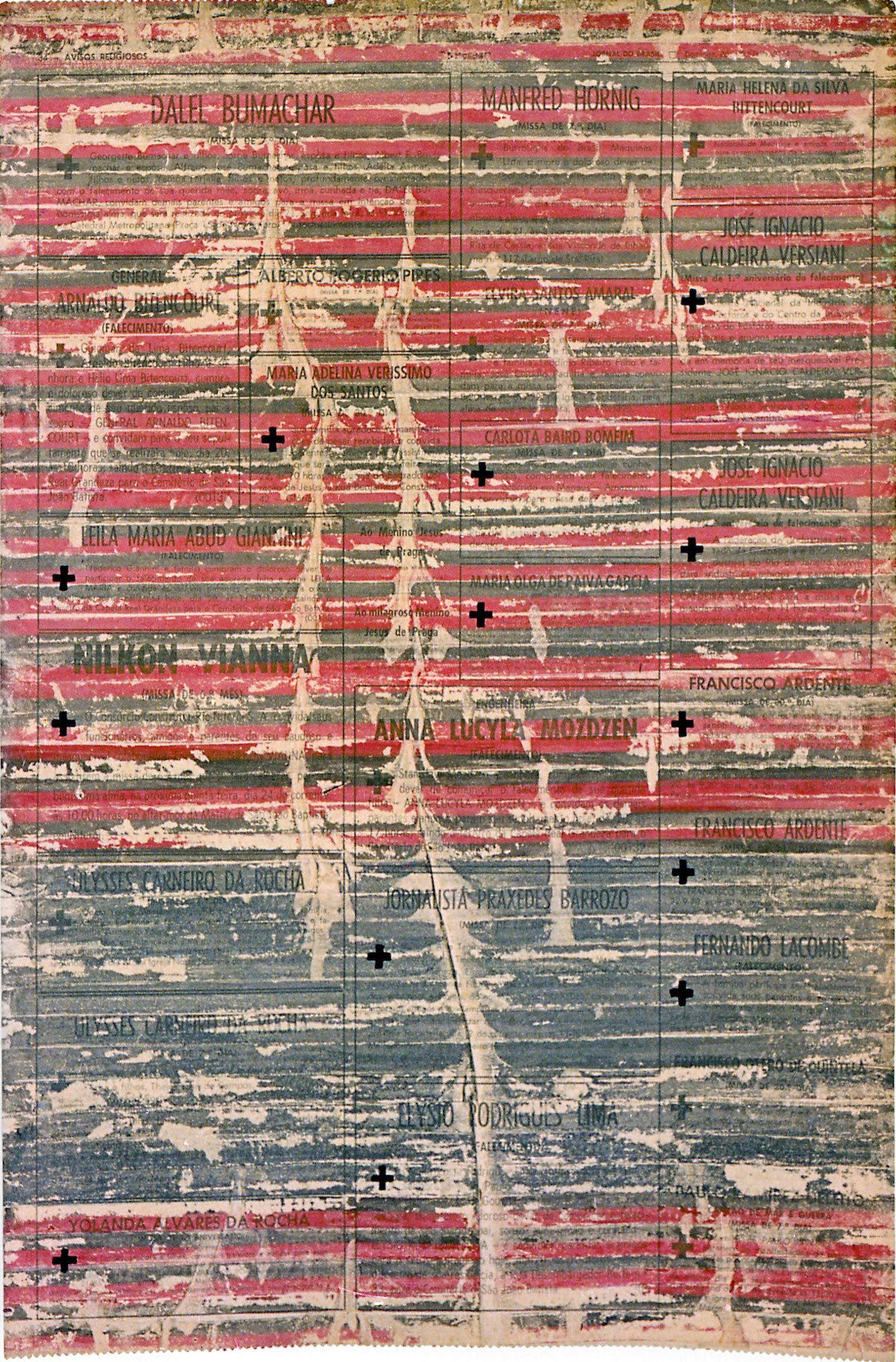 L’artiste brésilienne Ana Vitória Mussi (née en 1943) a également employé des journaux dans sa série Jornais(Journaux, 1970). Des coupures de presse sont déchirées et couvertes de peinture, les mots et les images sont censurés, racontant au final de nouvelles histoires et créant des narrations médiatiques alternatives. L’objectif strictement informatif du journal est ici nié et un nouveau médium est produit à travers le recours à l’imagination et la déconstruction.