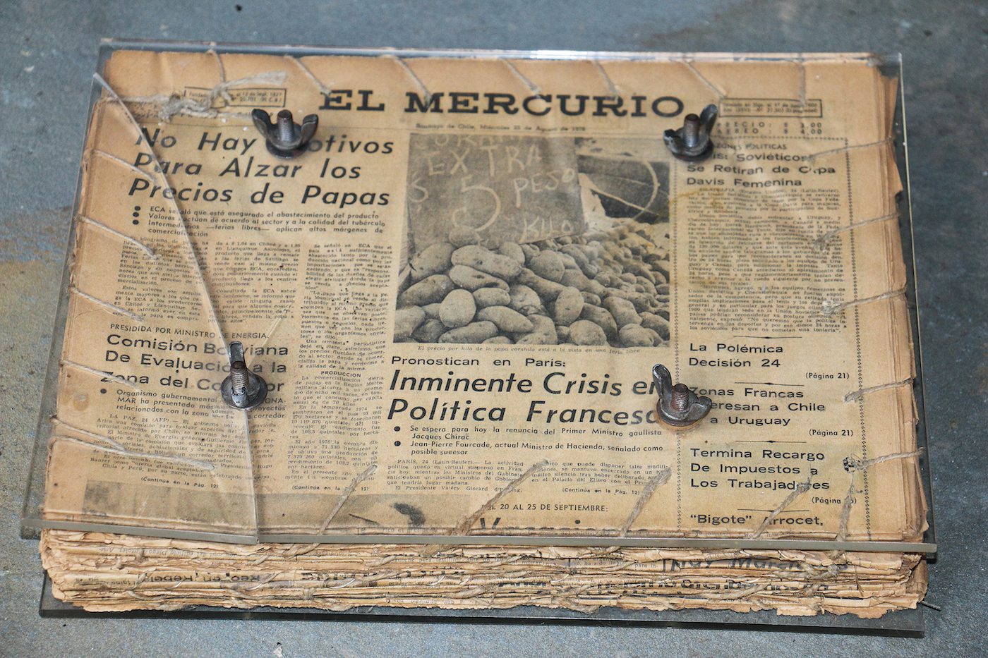 Les journaux quotidiens ont longtemps joué un rôle crucial dans la dissémination de la propagande d’État, mais utilisés par Parra et Mussi, ils sont devenus des matériaux stratégiques pour lutter contre la diffusion de la désinformation destinée à troubler et effrayer les communautés ciblées. Sous la férule malveillante d’Augusto Pinochet, l’artiste autodidacte Catalina Parra (née en 1940), a renversé le pouvoir du texte en utilisant du papier journal, des coupures de presse et des collages. Diario de vida (Journal de vie, 1977) reprend des journaux d’El Mercurio empilés entre deux plaques de plexiglas, telle une capsule témoin qui témoigne de la suppression du langage sous la dictature chilienne et illustre les pressions subies pour se soumettre à cette force.