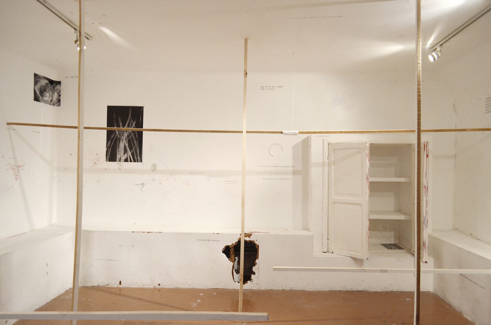 SiEntaXis (sex sintaxis) Minia Biabiany, Cráter Invertido, México DF, 2015. Installation with wood, ink transfers, plastic bag, water, photographs on transparent paper. Courtesy the artist.