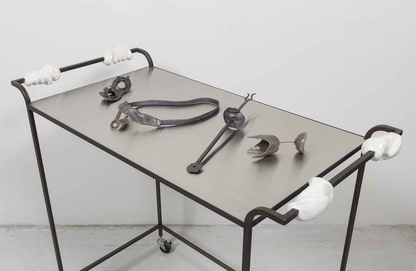 JP: There is one sculpture and a series of prints. The sculpture is titled Operator I (with Blinder, Muter, Penetrator, Aborter), 2017. The piece resembles a surgeon’s trolley, with four “tools” on top, which the titles in parentheses refer to. I think of that object as an analogy to a relationship, that’s why there are two sets of handles attached to the trolley, to underline the collaborative aspect. The work is quite personal, and at the same time addresses mechanisms of oppression that can exist on social and political levels as well. “Muting” for instance is a mechanism that can appear within an intimate relationship, but it can happen systemically as well by violating freedom of speech rights. And the prints that were selected for the bienniale are part of a series called Expanded, collagraphs that show stretched pantyhose printed on paper.