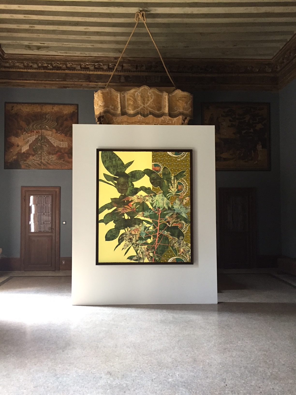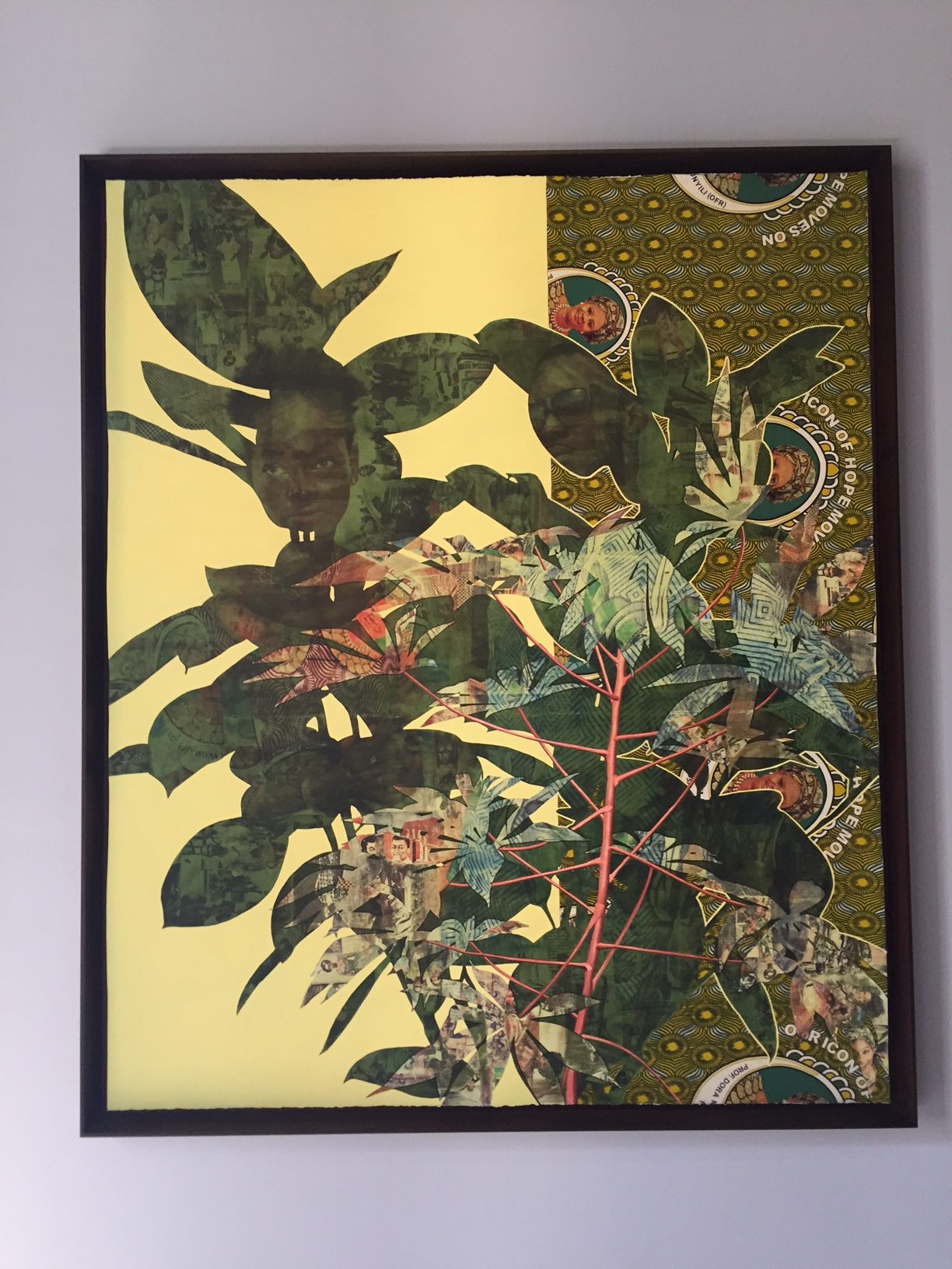 Njideka Akunyili Crosby, Cassava Garden, 2015, Acrylic, transfers, colored pencils, charcoal, commemorative fabric on paper. Courtesy of Victoria Miro Gallery. Image © Contemporary And