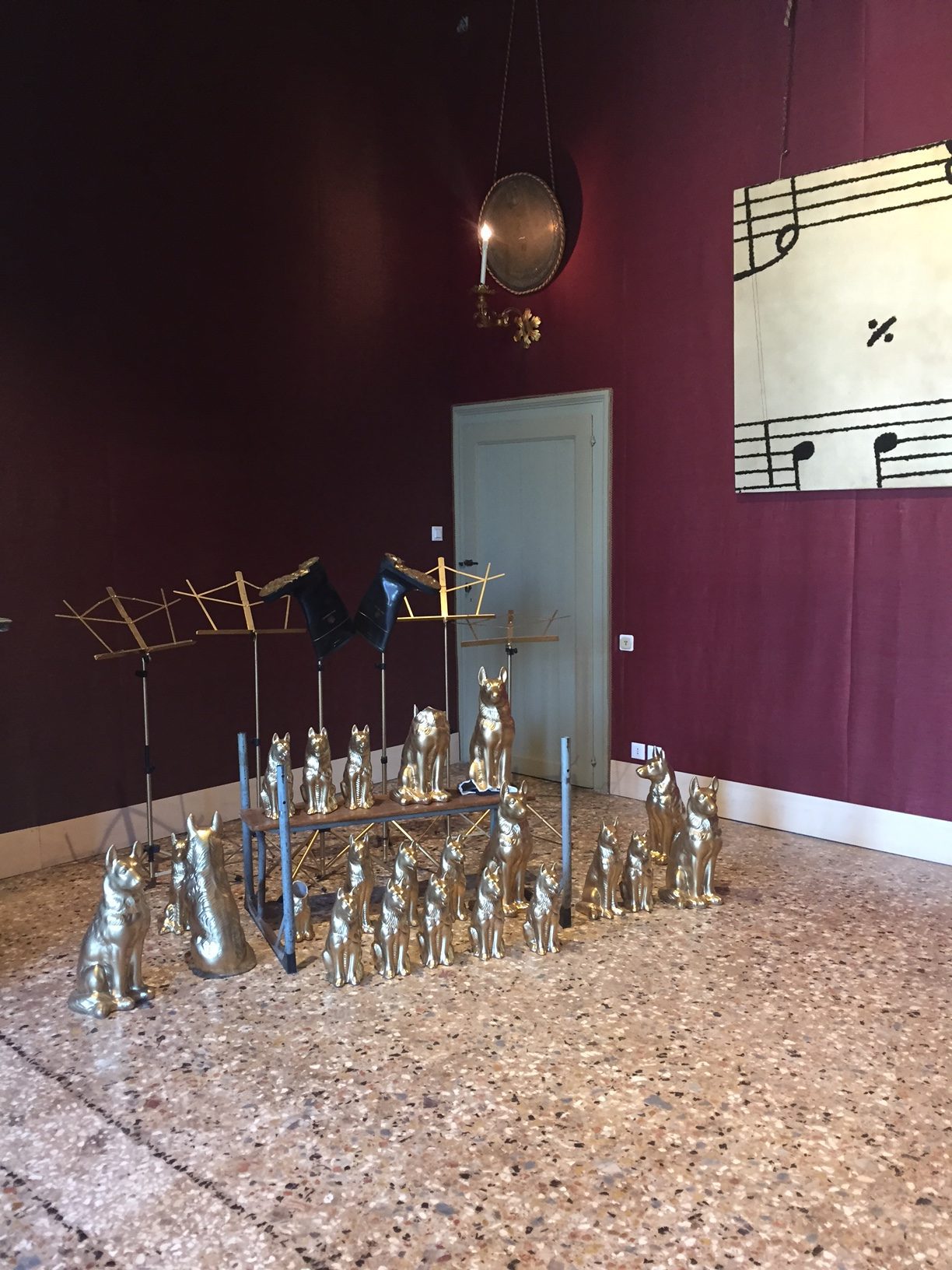 Kemang Wa Lehulere, Another Homeless Song (für RRR Dhlomo) 1, 2015, Slavaged school desks (wood and steel), music stands, gumboots, paint, porcelan dogs © Contemporary And