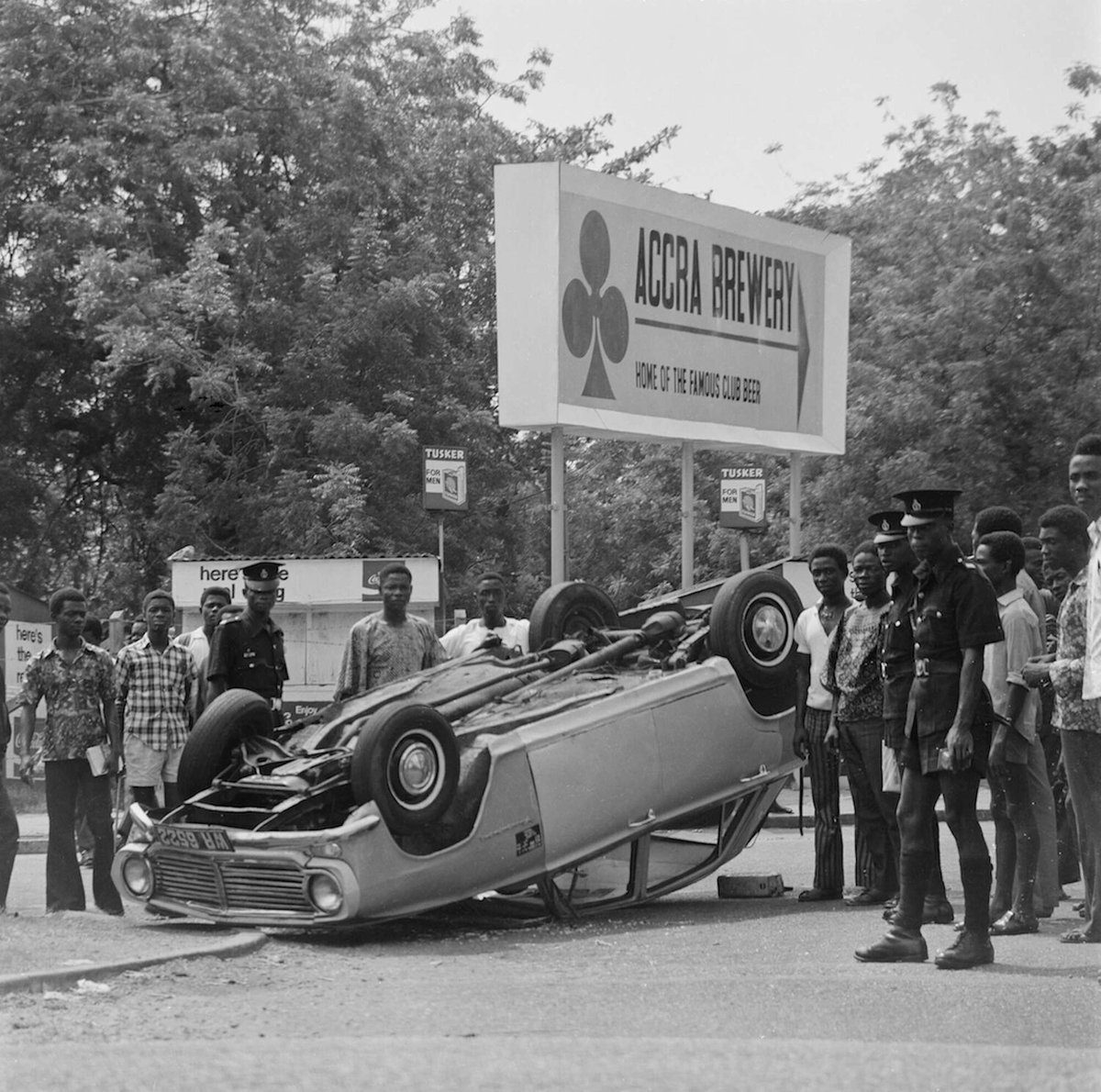 A car accident outside Accra Brewery, year unknown. Photograph: © James Barnor. Courtesy Nubuke Foundation
