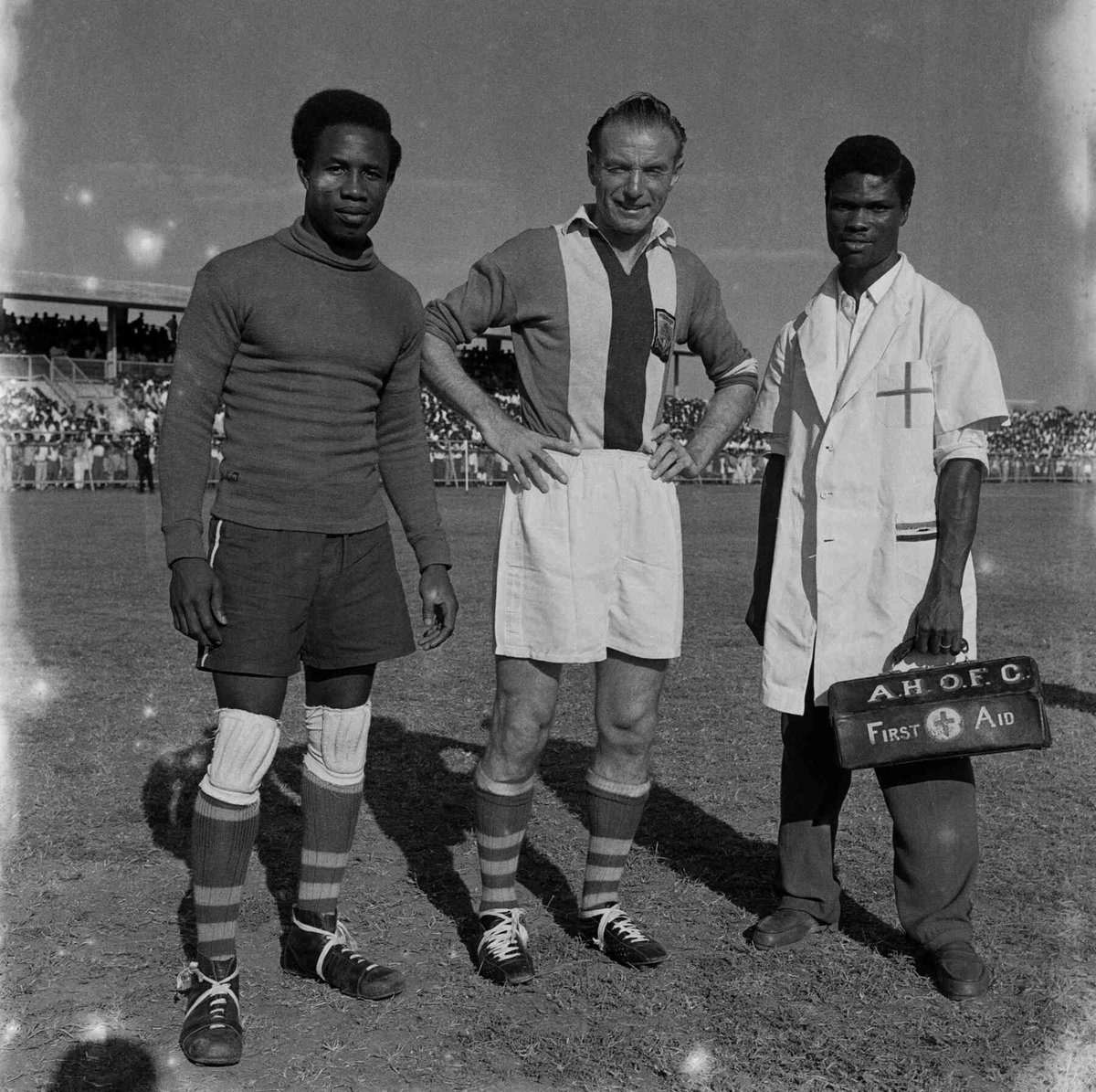The soccer players Lamptey Mills and Stanley Matthews with an Accra Hearts of Oak team doctor at a friendly match in 1957. Image: James Barnor. Courtesy Nubuke Foundation