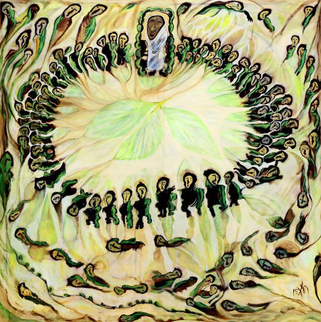 Ishag has forged a unique and expansive practice which is not defined by a singular style or movement. Her work embraces and expresses different earthly and spiritual landscapes and histories of Sudanese visual culture across many eras. The artist also roots her practice around subjects including women, spiritualism, Zar ceremonies, plants and stories from her mother and grandmothers in relation to how she has experienced them.