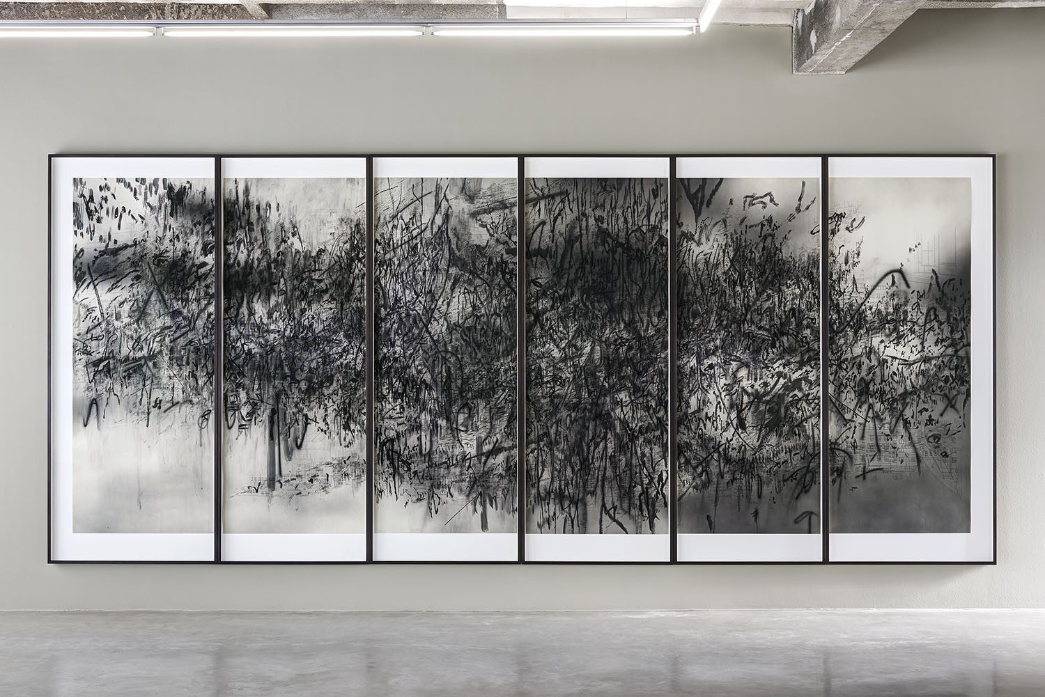 The images and thoughts informing Mehretu’s recent work are from either far right anti-immigration rallies or detention centers for migrants at US borders. The issue of legal and illegal migration or the need to move in order to find a home or life elsewhere, is core to the work and the way Mehretu has been thinking through this time. Especially its complexities in relation to our global condition – with climate catastrophe getting worse and worse, a pandemic, and the ongoing struggle against the history of colonialism and neo-colonialism, among other crises.