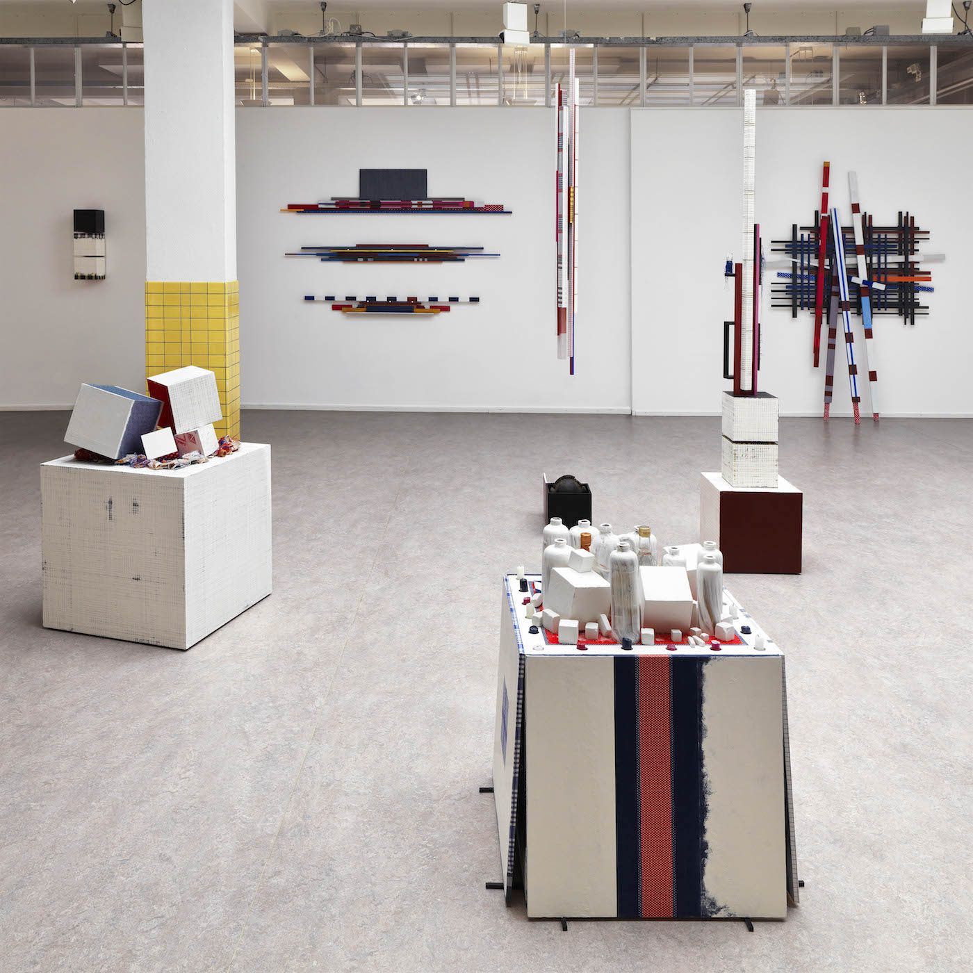 Painted wood, cotton textile, kaolin, bottles 112 x 96 x 16 inch (284 x 244 x 41 cm) photo© Aatjan Renders. Courtesy the artist