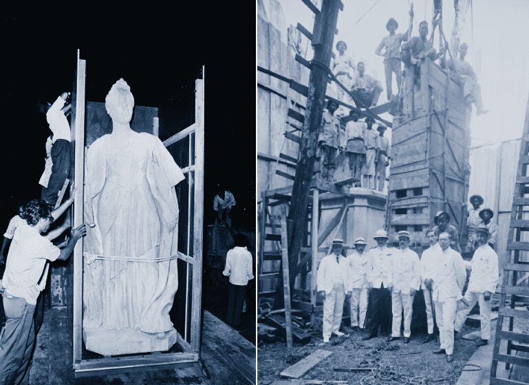 SB: Photography plays an important role in many stories, but a lot of stories about Suriname are unknown. So it was a search for stories and protest hidden in different archives. Not all photographs are stored in a way that you can see a history of emancipation through those images, you need to connect the dots. For example in the history of the photographs of the statue of Queen Wilhelmina, the Dutch queen. The statue originally stood in the center square of Paramaribo. You can find pictures of 1922, where the artist poses next to his creation in his studio. Then images with people transporting, adoring or displacing it; all in the context of a colonial history. The different connections with the statue become visible. Like when in 1923 workers sit on top of the transportation crate, while below them the white men in white uniforms are posing in front of it. This shows colonial relations of power. And you see Surinamese people taking down the statue just before independence day in 1975. The pictures are all very consciously staged and raise question like: Who is important and what is the relation to the statue? Who is allowed to be in the picture? And where are they positioned in relation to the statue? From these images you can derive and determine the power relations regarding the statue and thereby the Dutch colony. I visited different archives to find these photographs and to see the (changing) colonial relationships. So in a way it is often documented but not with the intention of showing protest, so it also about decolonizing the context of the photographic image and showing how the gaze through the camera is a colonial one.