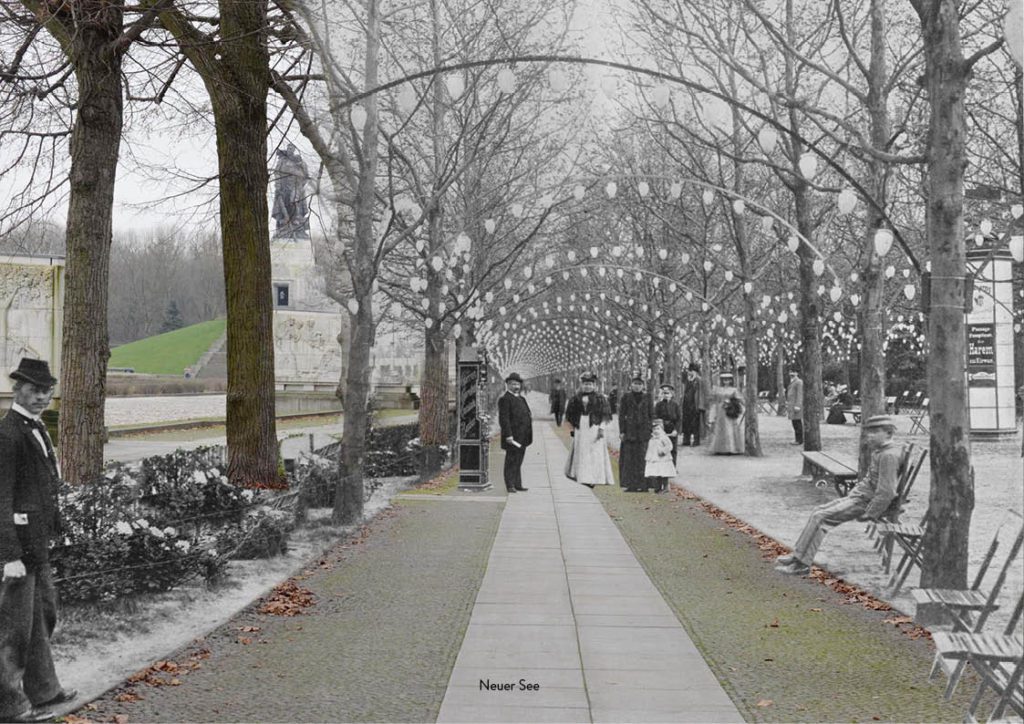 In 2018, audio artist Caroline Böttcher released Arbeiter, Alpen und Attrappen, an audio walk framing the 1896 Gewerbeausstellung within its social and political context. Narrated through the perspective of three white fictional characters – Julius, an exhibition supervisor; Clara, a newly arrived maid; and Hans, an experienced tour guide – the audio walk introduces the listener to that time and describes the artificial landscape constructed in Treptower Park to showcase Prussian hegemony. For Bottcher, it is important to claim a memory of the Gewerbeausstellung that renders visible the imperialist, colonialist, racist, and militaristic propaganda upon which it was founded. Through reconstructed testimonies and sounds, a different perception of and access to history is performed, a history whose traces are still visible in our urban fabric and social hierarchies. The audio walk brings us to the waters of the Karpfenteich to confront us with the Colonial Village that haunts the pond.