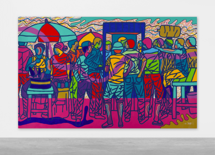 Saudi artist Rashed Al Shashai, for instance, comments on consumerist culture in Brand 2 (2019). A light box, masked by an ornamented window screen, it requires audiences to move closer before they can recognize that the colorful shapes are plastic cases of health and beauty products rather than stained glass. Beyond the optical illusion, we are left with little food for thought. Home (study of soap) by French artist Emmanuel Tussore pushes us harder. The series of twenty-one photographs, developed in 2017, documents models that Tussore carves out of soap of ruined homes and sites, paying tribute to Aleppo, one of the oldest soap-production centers, and the ongoing war in Syria. Palestinian artist Hazem Harb’s critique of the continuous rewriting of East Jerusalem’s history by changing its architecture is lazy in its literalness. An installation titled East Transformation – Transformation of the East (2019), it presents a maquette of a brick-tiled pitched roof against a photographic backdrop of the city and sounds of bulldozers tearing down buildings. But even such a loose theme can at times stretch itself too thin. Cameroonian painter Ajarb Bernard Ategwa continues exploring Douala’s urban fabric in Change and Game Boys #1 (both produced in 2018). The acrylic paintings are vivid snapshots of his hometown, captured in bold colors and animated lines. Their sheer size and compositions absorb audiences into the city’s market interactions.