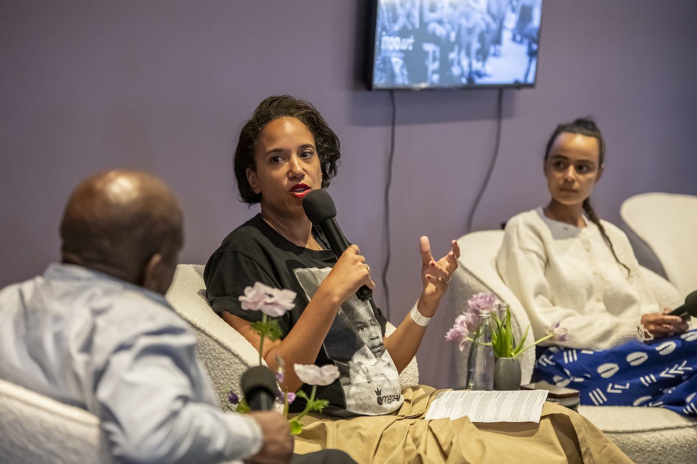 FNB Art Joburg Talk titled “The Art of Dialogue: Living Archives, Memory and Practice.” with Sam Nhlengethwa (left) , C& Director Yvette Mutumba (center), and writer Gillian Fleischmann (right). Photo: Anthea Pokroy.