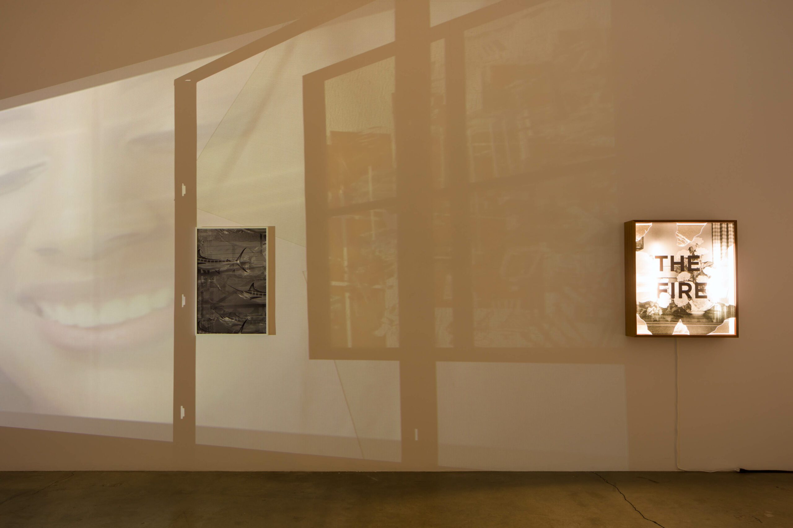 Jibade-Khalil Huffman, Installation view, “Kush is my Cologne,” 2017, Anat Ebgi, Los Angeles, pictured (l) “Untitled (acid rap),” 2017, archival inkjet print (r) “By the Author of Another Country and Nobody Knows My Name,” 2017, transparencies in lightb