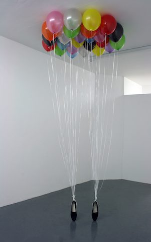 Hansi Momodu-Gordon: P.Y.T. (2009) uses found objects and subtle gestures, as a pair of black penny loafers are held on tiptoes by a cloud of colorful balloons touching the ceiling. I am interested to know what the title stands for, but also in the role found objects play in your earlier works and how this is shifting in your more recent practice.