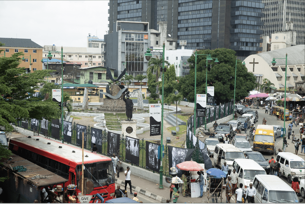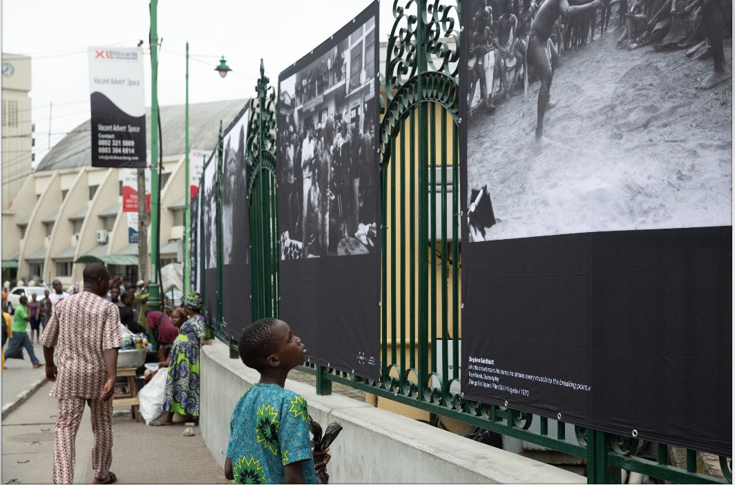 Le lieu d’exposition est un espace public bien connu de Lagos : Tinubu Square, dont la forme ovale va à l’encontre de ce que son nom suggère. Soixante-quatorze photographies en grand format imprimées sur de la bâche sont accrochées aux hautes grilles de la place, conférant à l’espace une allure de séquence de film grandeur nature. Ses abords animés en font l’endroit idéal pour attirer l’attention du public, le surprendre avec l’histoire, lui faire découvrir de nouvelles informations et lui montrer des clichés de toute beauté.