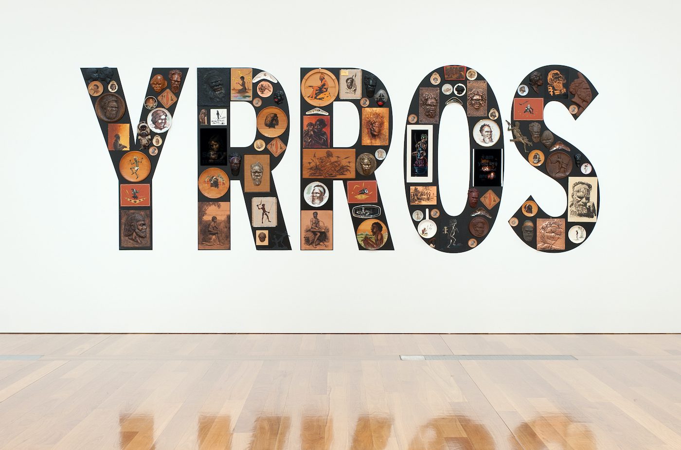 Tony Albert, Girramay/Yidinji/Kuku Yalanji peoples Australia QLD/NSW b.1981, Sorry, 2008. Found kitsch objects applied to vinyl letters, 99 objects: 200 x 510 x 10cm (installed). The James C. Sourris Collection. Purchased 2008 with funds from James C. Sourris through the Queensland Art Gallery Foundation Collection: Queensland Art Gallery