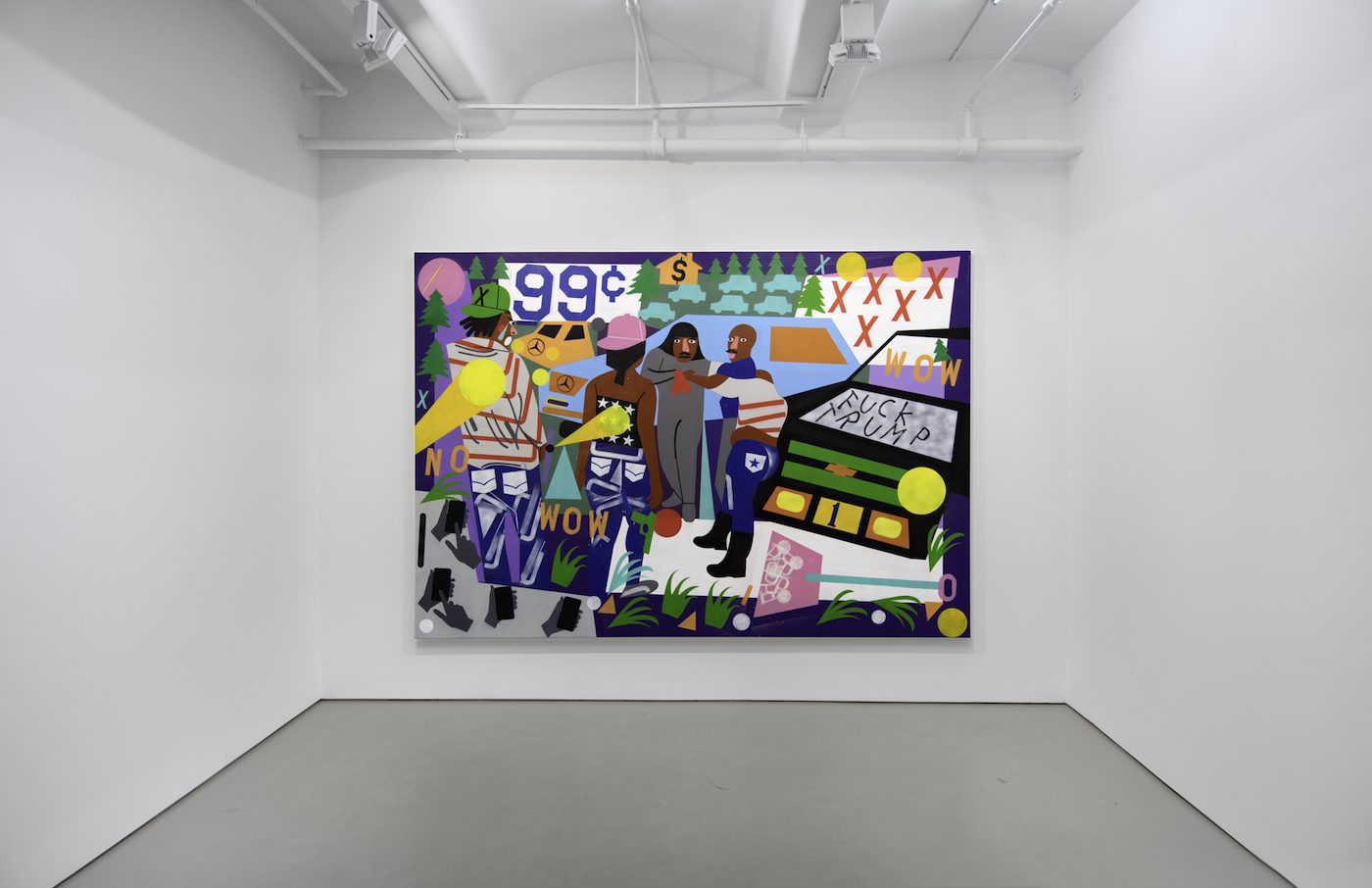 Nina Chanel Abney, Seized the Imagination, Installation view on « Penny Dreadful », 2017, acrylic and spray, paint on canvas, 84 x 120 inches @ Jack Shainman Gallery New York.