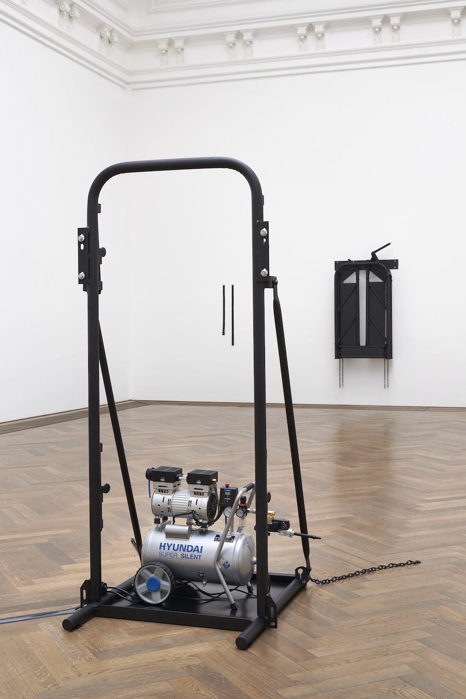 Tiona Nekkia McClodden,THE POETICS OF BEAUTY WILL INEVITABLY RESORT TO THE MOST BASE PLEADINGS AND OTHER WILES IN ORDER TO SECURE ITS RELEASE, Kunsthalle Basel, 2023, exhibition view, front: HEAD LOSS and APNEA, both 2023, photo: Philipp Hänger / Kunsthalle Basel