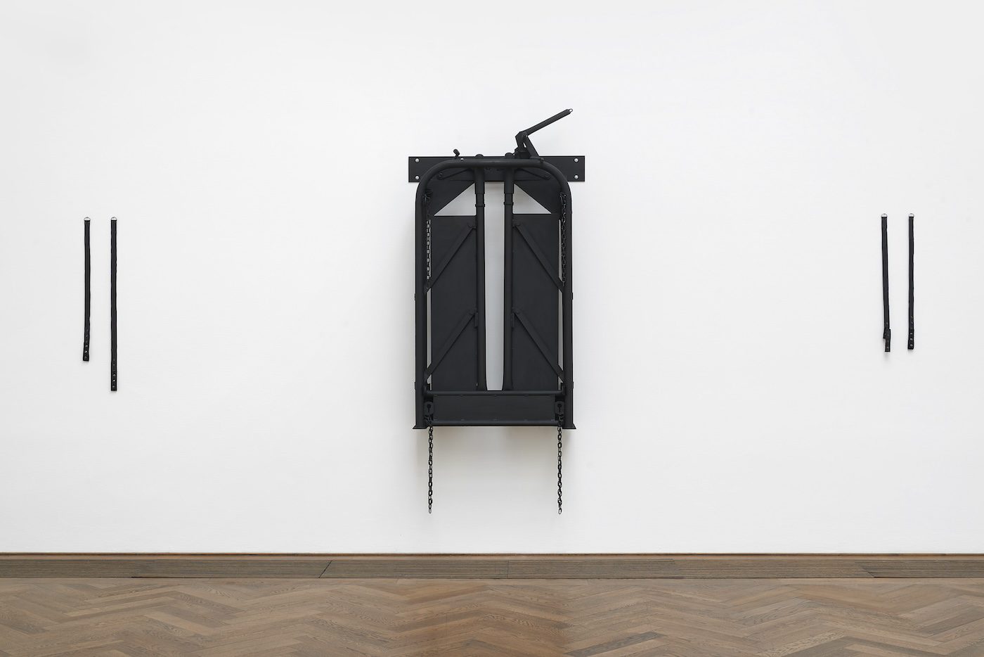 Tiona Nekkia McClodden, THE POETICS OF BEAUTY WILL INEVITABLY RESORT TO THE MOST BASE PLEADINGS AND OTHER WILES IN ORDER TO SECURE ITS RELEASE, Kunsthalle Basel, 2023, Installation view, center: A MERCY IV, 2023, left and right: THRASHER [I-XVI], 2023, Photo: Philipp Hänger / Kunsthalle Basel